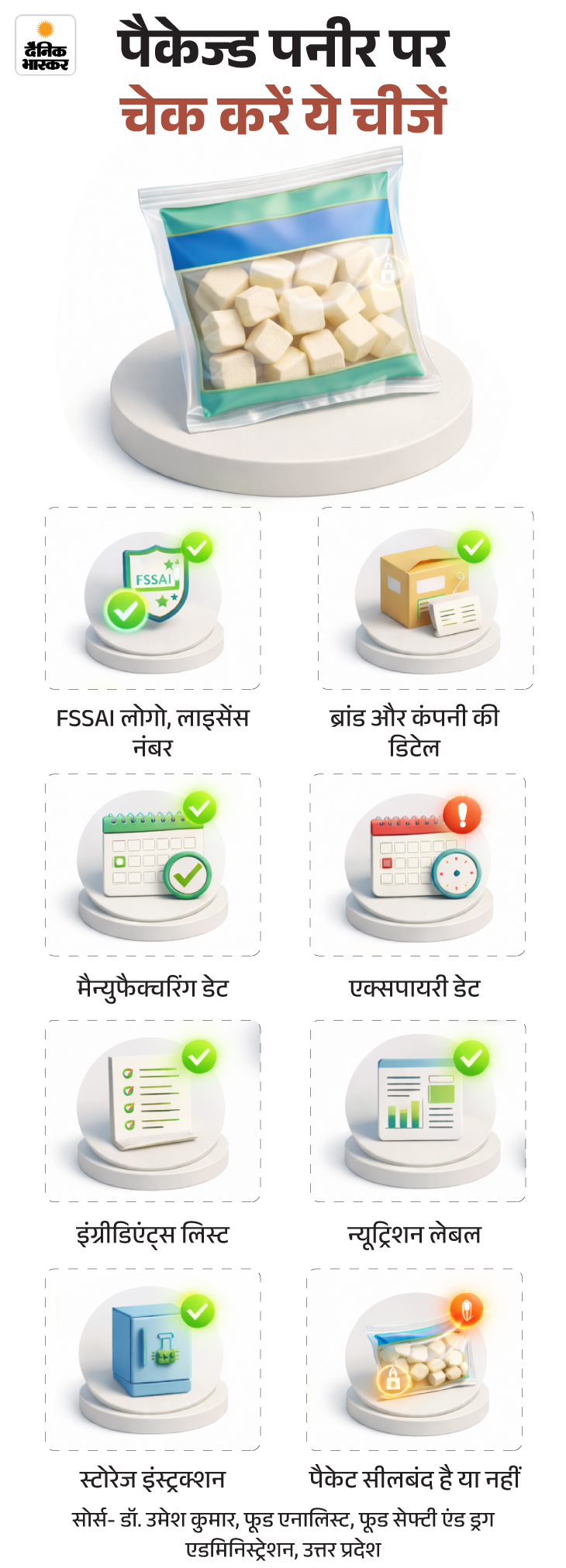 जवाब- पैकेज्ड पनीर लेते समय लेबल पढ़ना सबसे जरूरी है। पनीर के पैकेट की क्वालिटी, हाइजीन और ट्रेेसेबिलिटी तय करने के लिए लेबल पढ़ना जरूरी है। ग्राफिक में देखिए लेबल पर क्या देखना चाहिए-