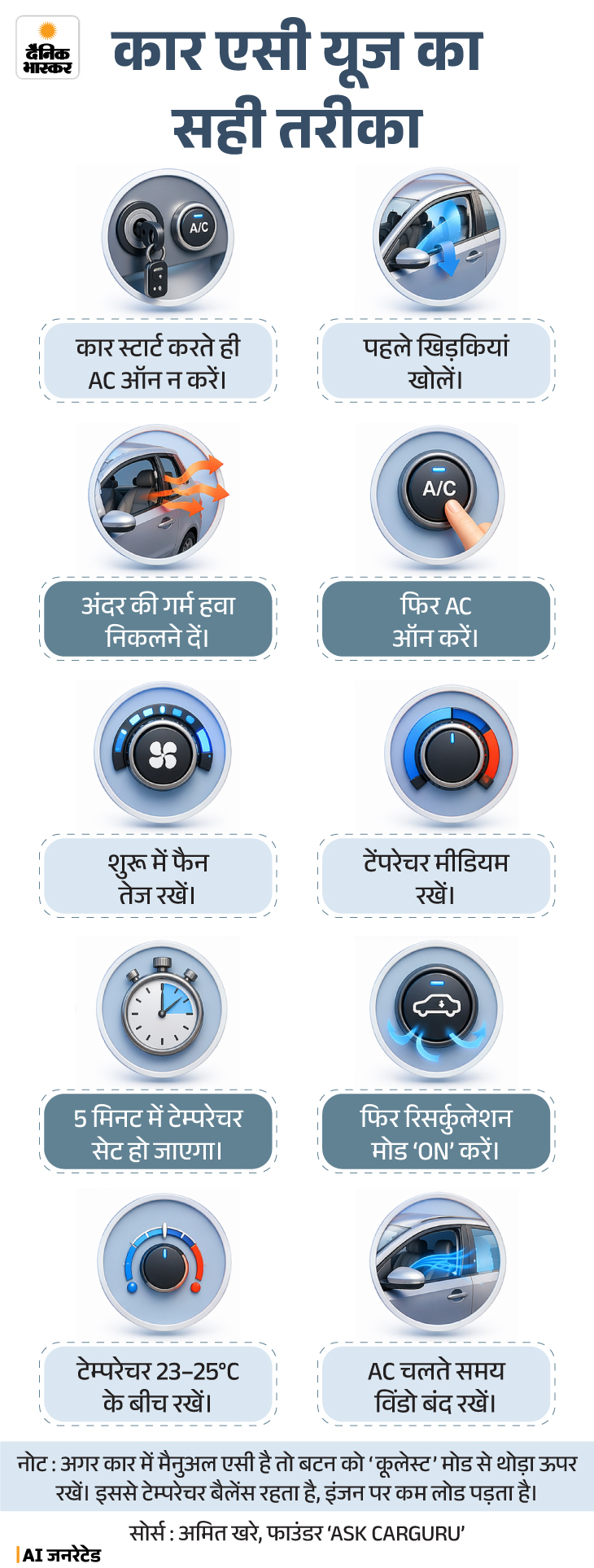 जवाब- सही इस्तेमाल से एसी का परफॉर्मेंस, इंजन और माइलेज बेहतर रहते हैं। इसके लिए कुछ बातों का ख्याल रखें। ग्राफिक में स्टेप-बाय-स्टेप प्रोसेस देखें-