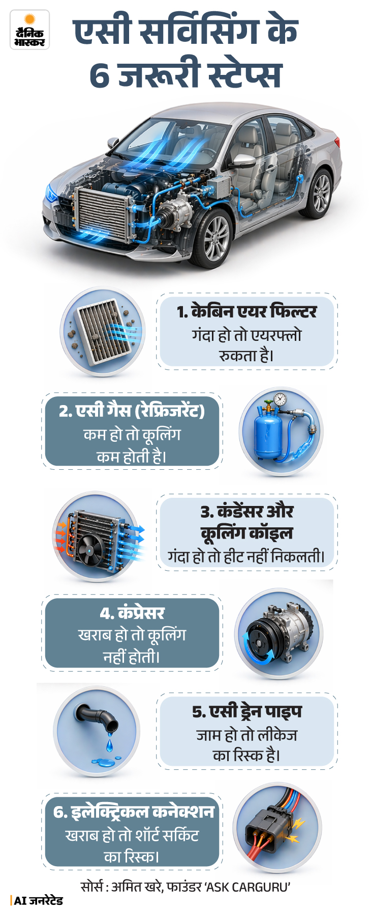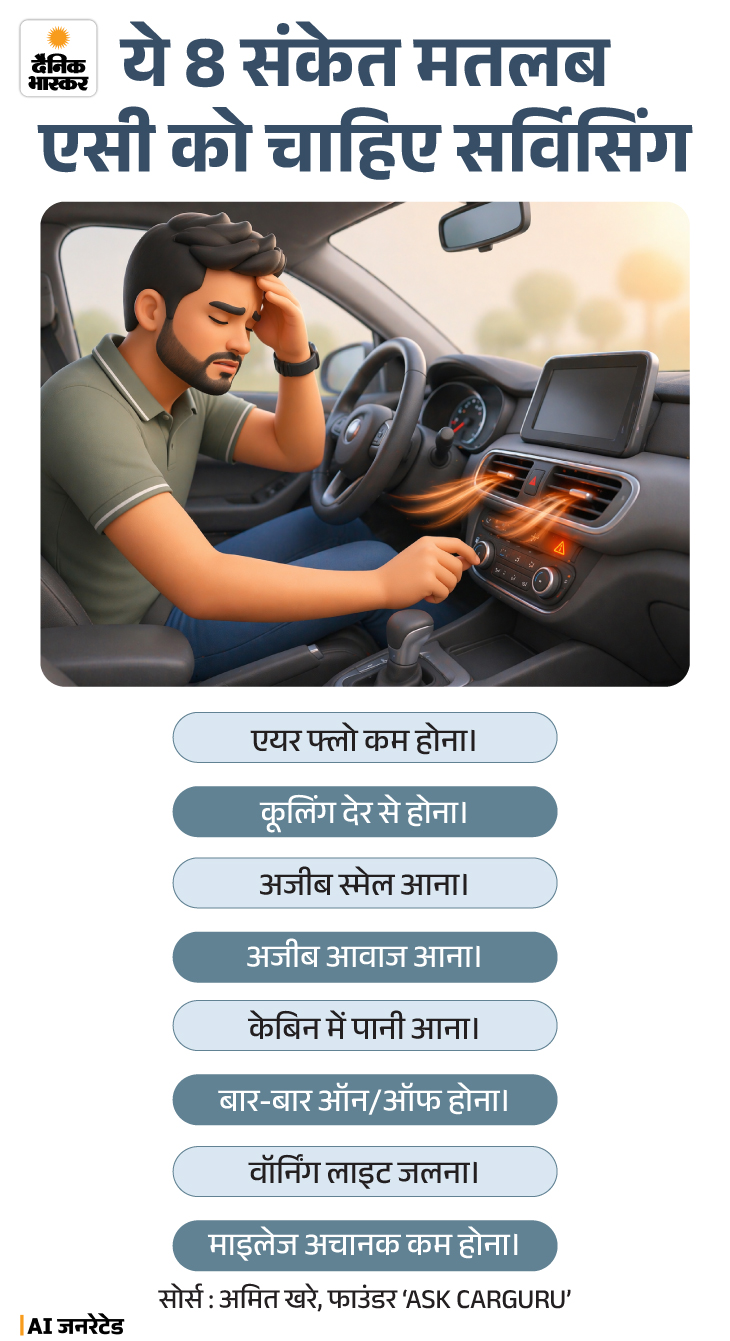 जवाब- घर के एसी की तरह कार एसी का भी रेगुलर मेंटेनेंस जरूरी है। छोटी-छोटी चीजों का ध्यान रखें तो परफॉर्मेंस बेहतर रहती है। जरूरी बातें ग्राफिक में देखिए-