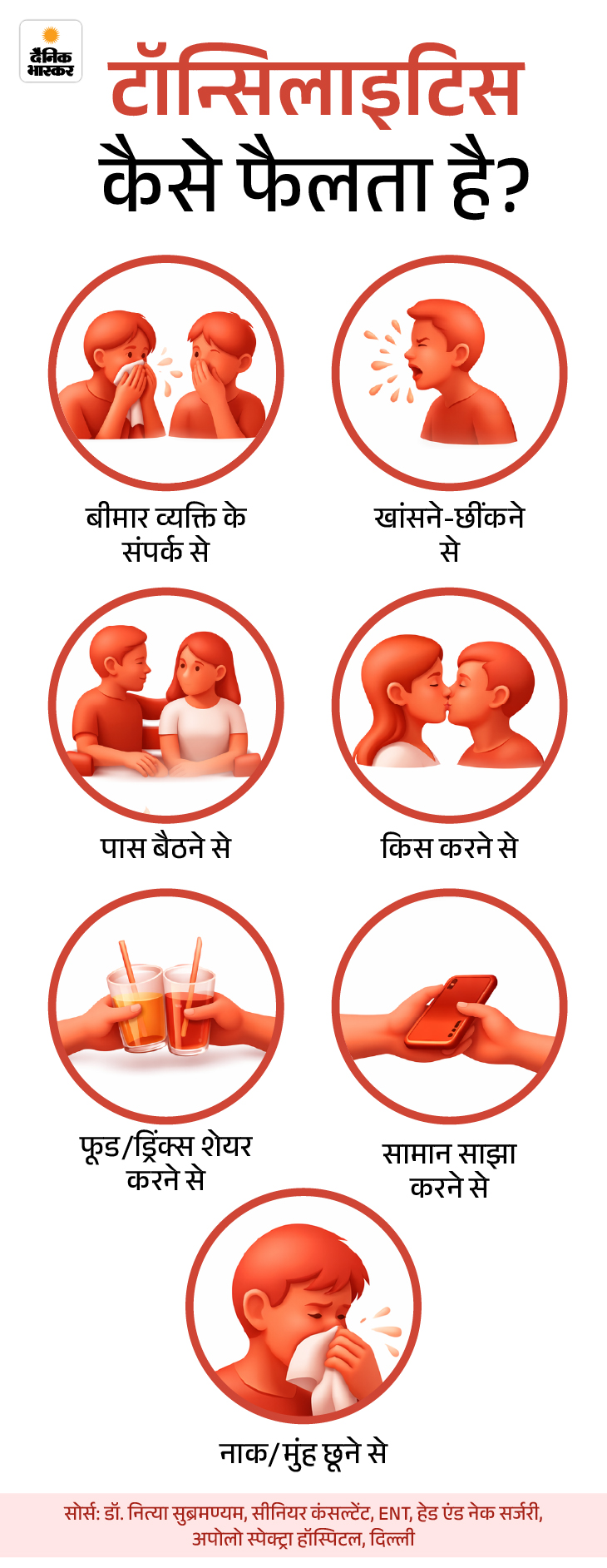 जवाब- हां, टॉन्सिलाइटिस पैदा करने वाले वायरस और बैक्टीरिया बहुत ज्यादा संक्रामक होते हैं। ये कई तरीकों से फैल सकते हैं। इसे नीचे दिए ग्राफिक से समझिए-
