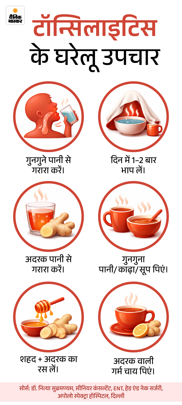 जवाब- हां, टॉन्सिलाइटिस में डॉक्टर की सलाह के साथ-साथ कुछ घरेलू उपाय लक्षणों को कम करने में मदद कर सकते हैं। इसे नीचे दिए ग्राफिक से समझिए-