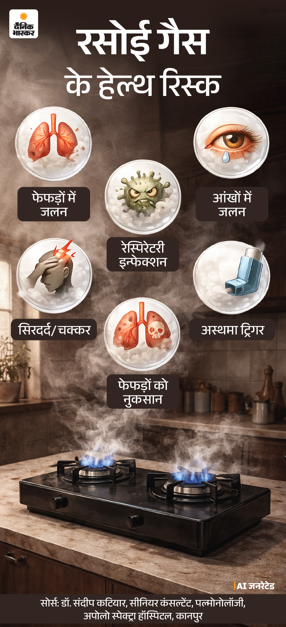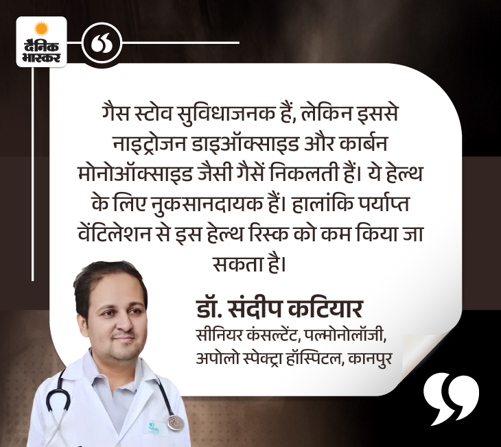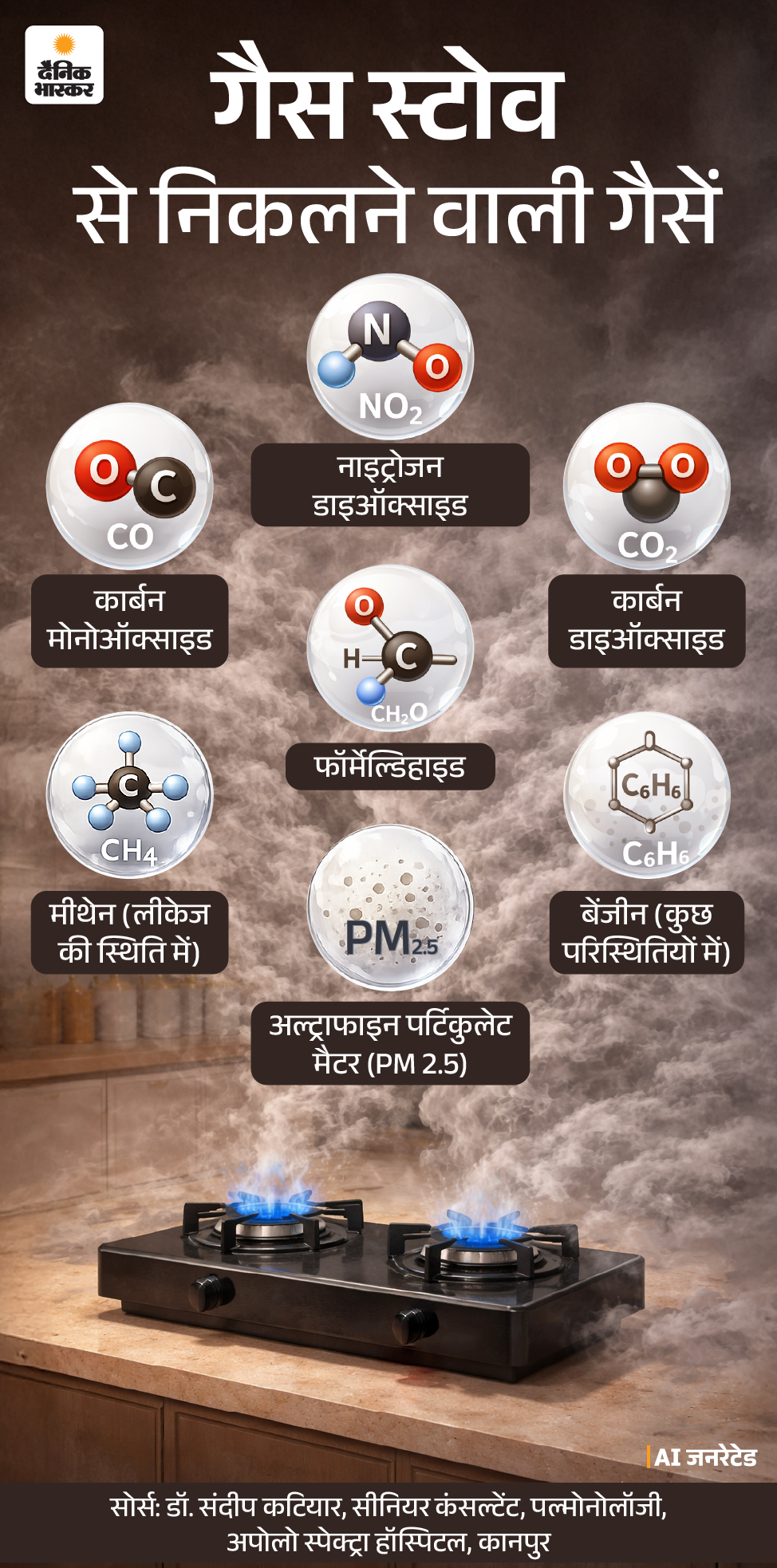 जवाब- गैस स्टोव के कण बेहद बारीक होते हैं, इसलिए नजर नहीं आते। गैस जलने पर नाइट्रोजन डाइऑक्साइड और कार्बन मोनोऑक्साइड निकलती हैं, जो हवा में मिलकर वेंटिलेशन कम होने पर घर में जमा हो जाती हैं।