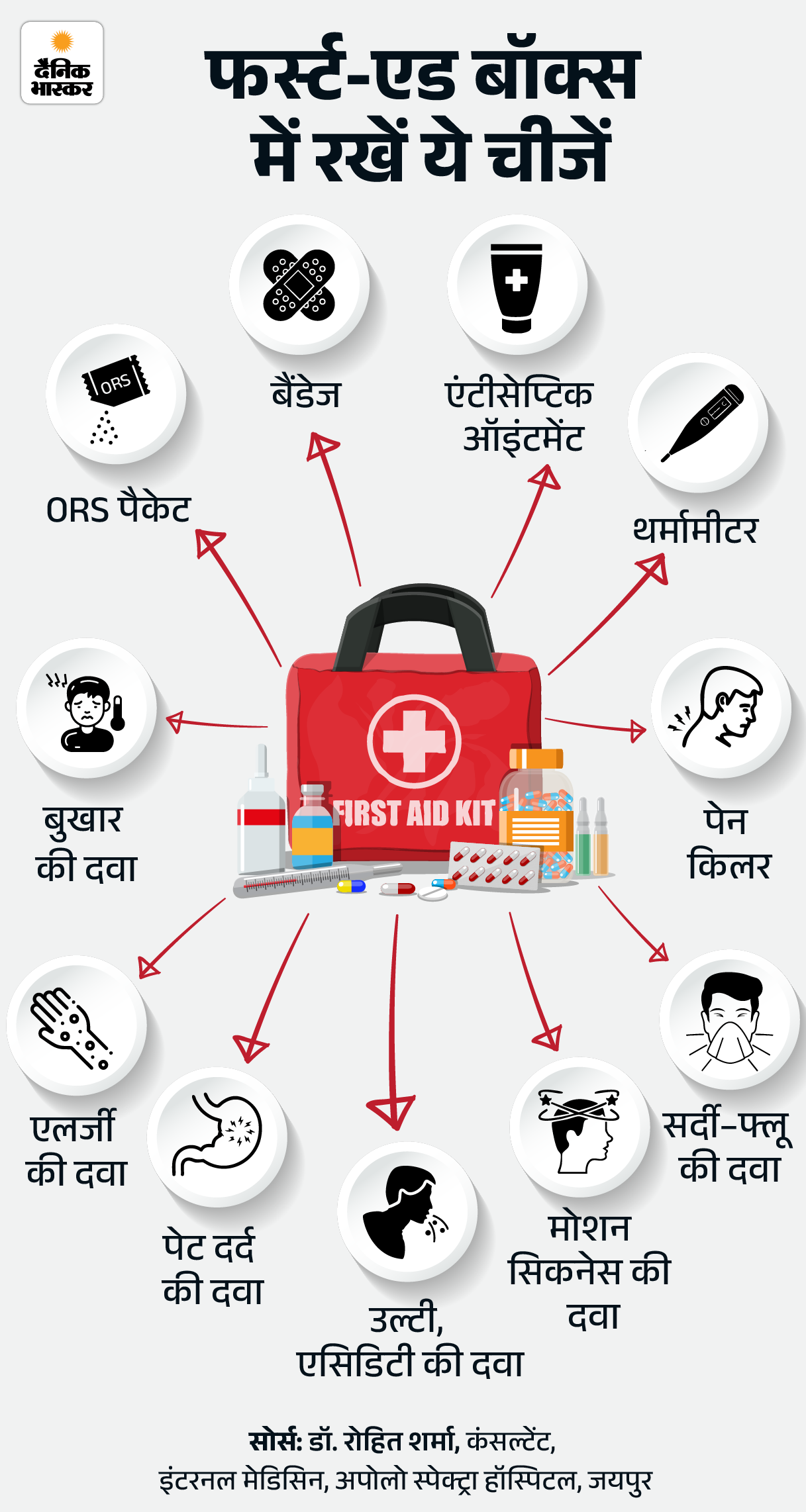 जवाब- ट्रेन ट्रैवल के दौरान अपने साथ फर्स्ट-एड किट जरूर रखें। इससे छोटी-मोटी क्राइसिस को आसानी से संभाला जा सकता है। इसमें कुछ चीजें जरूर शामिल करें। इसे नीचे दिए ग्राफिक से समझिए-