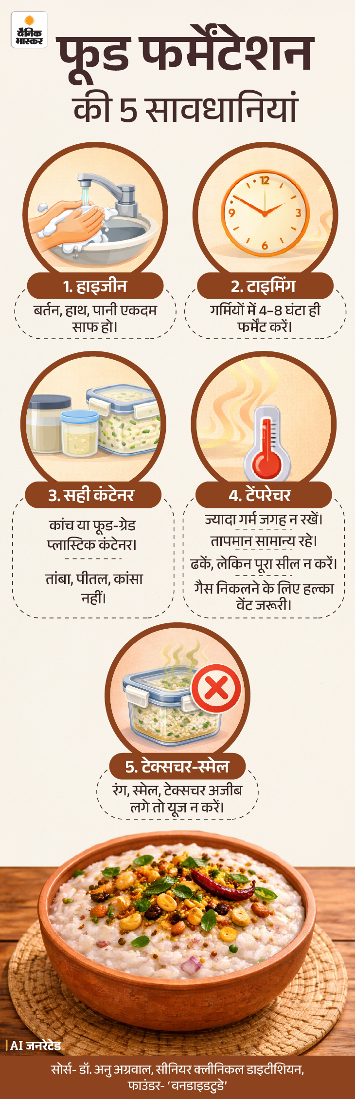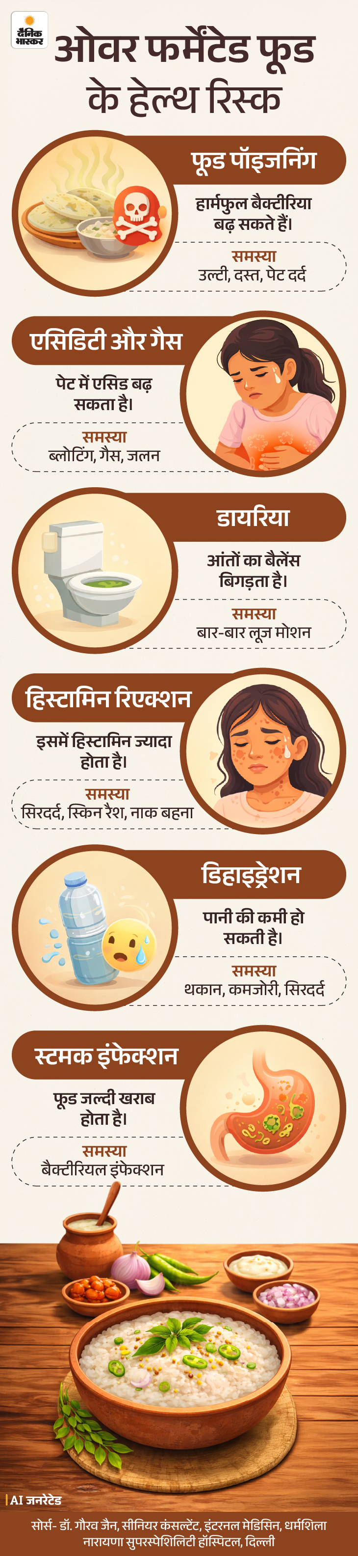 जवाब- गर्मियों में फर्मेंटेशन तेज हो जाता है, जिससे फूड जल्दी ओवर-फर्मेंट हो सकता है। यह कंडीशन फर्मेंटेशन के फायदे को नुकसान में बदल देती है और कई हेल्थ प्रॉब्लम्स की वजह बन सकती है। ग्राफिक में देखिए-