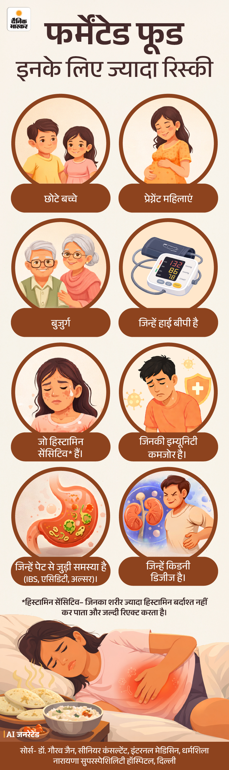 जवाब- फर्मेंटेड फूड हर किसी के लिए सेफ नहीं होता। कुछ लोगों में इसका रिएक्शन जल्दी होता है। इसलिए उन्हें इसे खाते समय खास सावधानी बरतनी चाहिए। ग्राफिक में देखिए-
