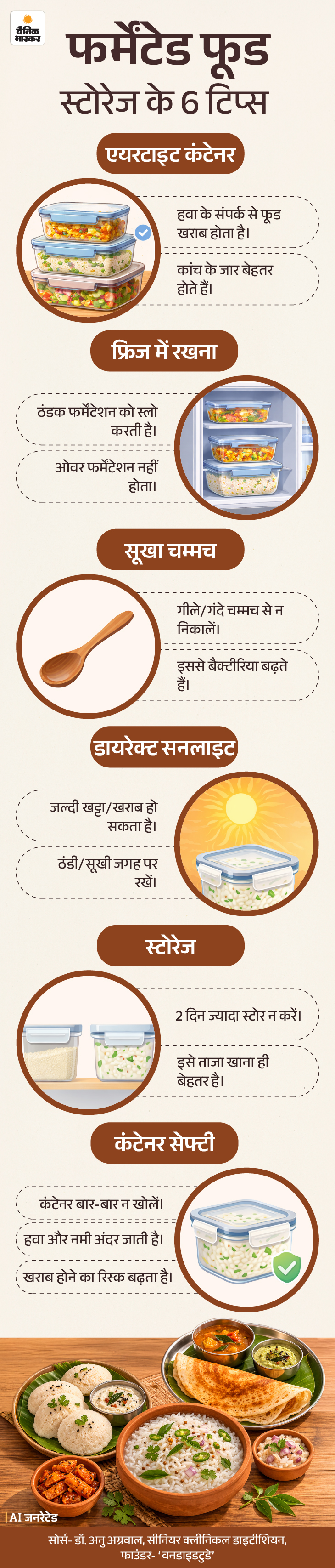 जवाब- गर्मियों में फर्मेंटेड फूड को सही तरीके से स्टोर करना सबसे अहम होता है। ग्राफिक में देखिए-