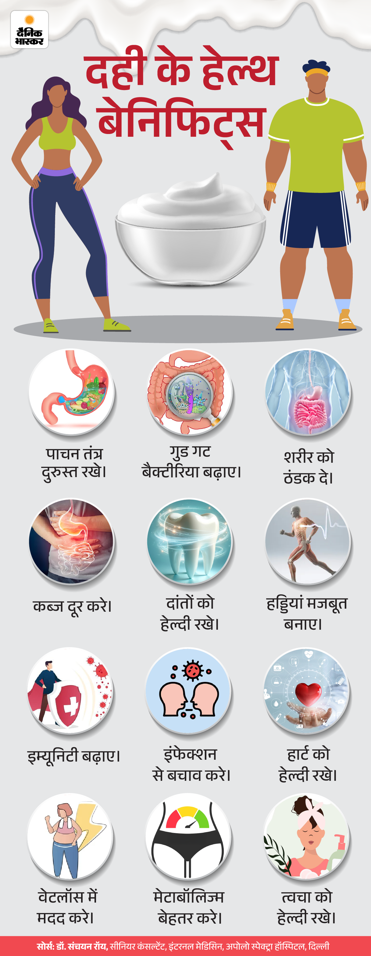 जवाब- आमतौर पर लोग यह जानते हैं कि दही खाने से पाचन आसान हो जाता है। इसमें मौजूद बैक्टीरिया हमारे गट में मौजूद गुड बैक्टीरिया की संख्या में इजाफा करते हैं। इससे पाचन तंत्र सुधरता है और इम्यून सिस्टम भी मजबूत होता है। यह हमारे दांत और हड्डियों की सेहत के लिए भी जरूरी है। ग्राफिक में सभी फायदे देखिए-