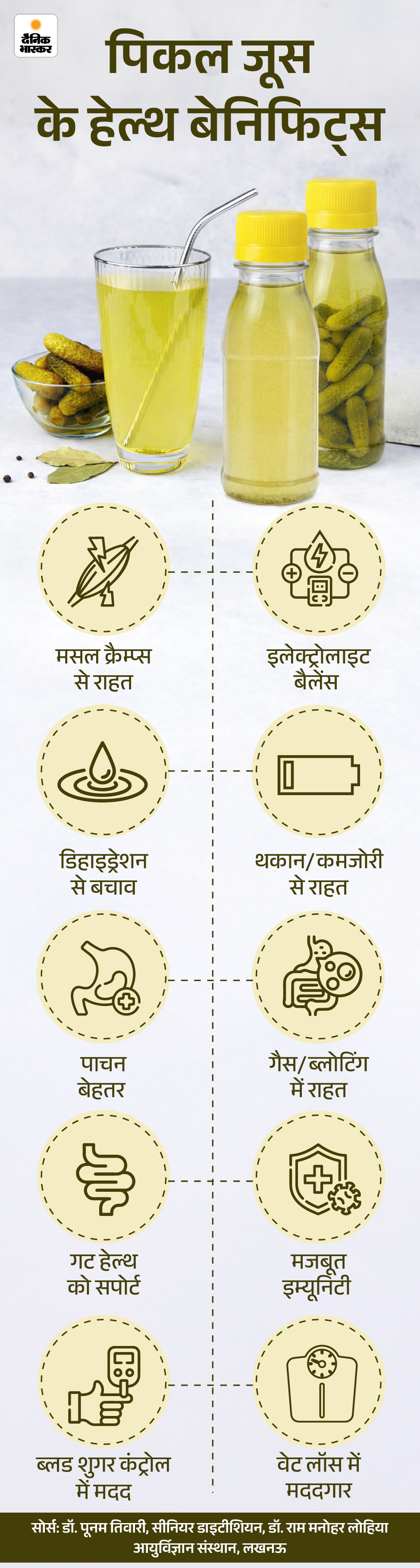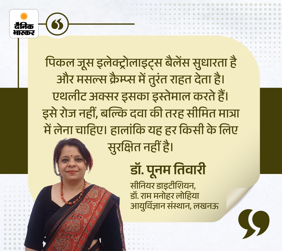 जवाब- सीनियर डाइटीशियन डॉ. पूनम तिवारी बताती हैं कि पिकल जूस को डेली हेल्थ ड्रिंक की तरह नहीं, बल्कि जरूरत पड़ने पर ही लेना चाहिए। जैसे मसल क्रैम्प्स होने पर, बहुत ज्यादा पसीना आने के बाद या ज्यादा थकान की स्थिति में।