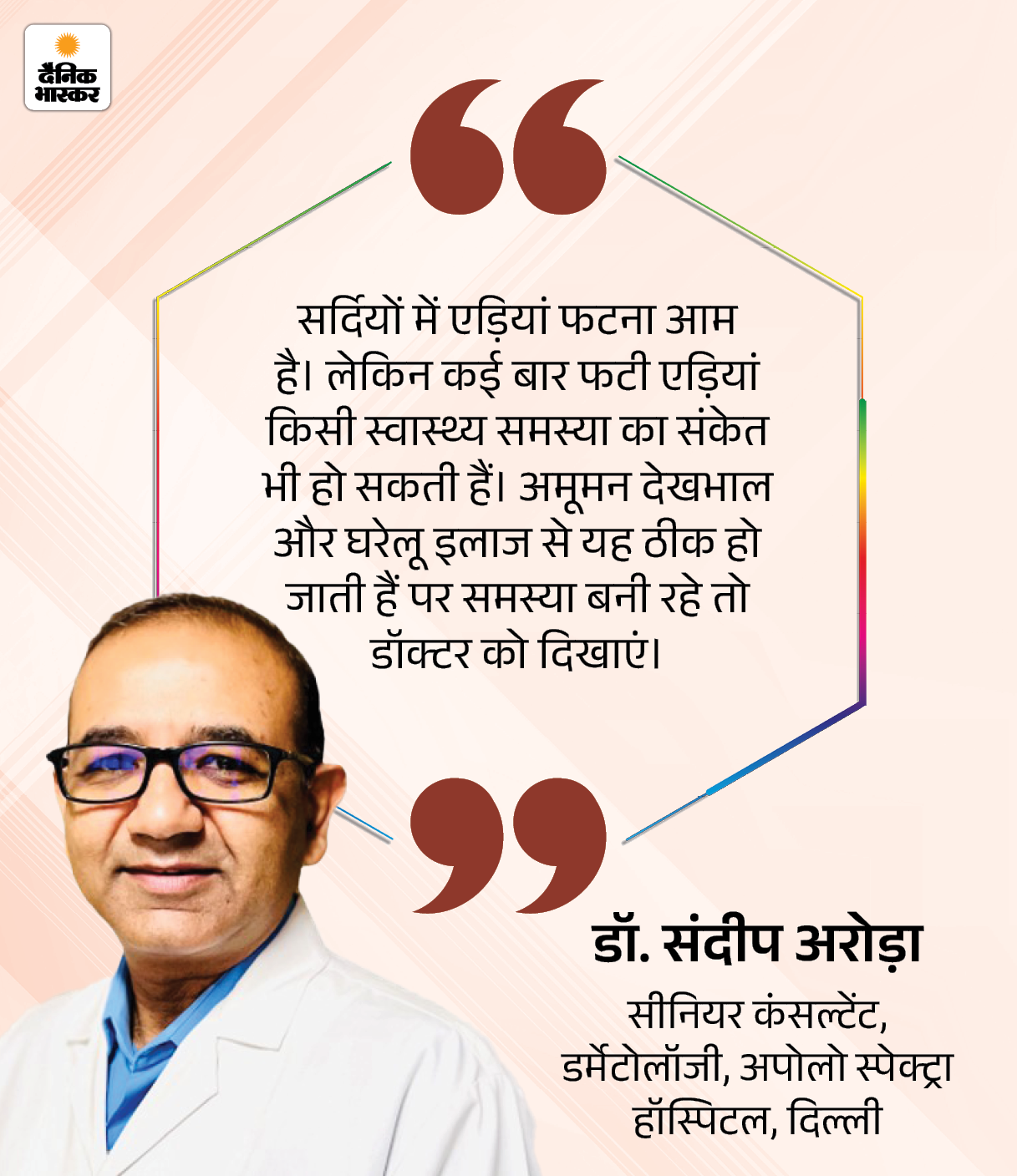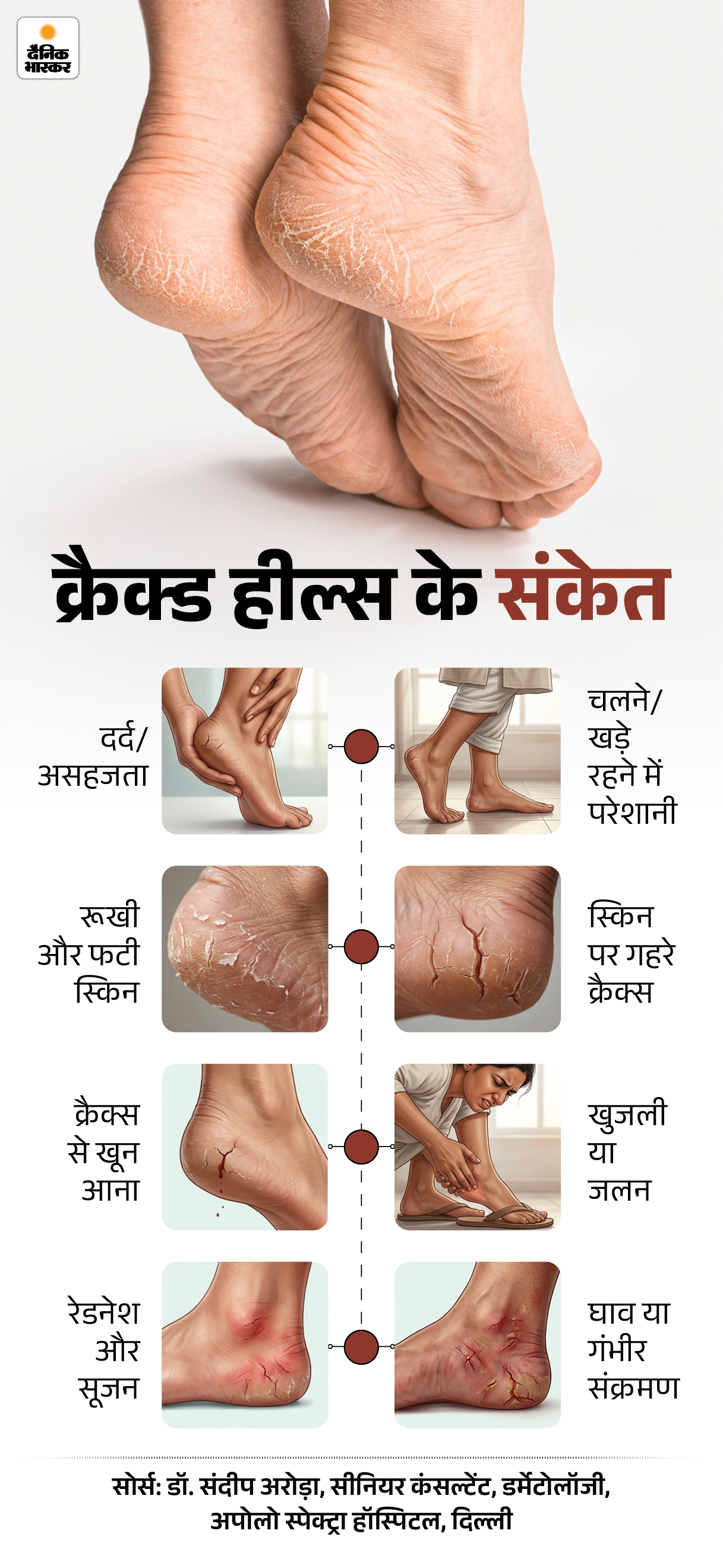 जवाब- डॉ. संदीप अरोड़ा बताते हैं कि क्रैक्ड हील्स कई बार किसी अंदरूनी स्वास्थ्य समस्या का संकेत भी हो सकती हैं। डायबिटीज या थायरॉइड होने या शरीर में विटामिन A, C या B7 (बायोटिन) की कमी होने पर एड़ियां फटने लगती हैं। साथ ही एक्जिमा और सोरायसिस जैसी स्किन डिजीज में भी क्रैक्ड हील्स दिख सकती हैं।