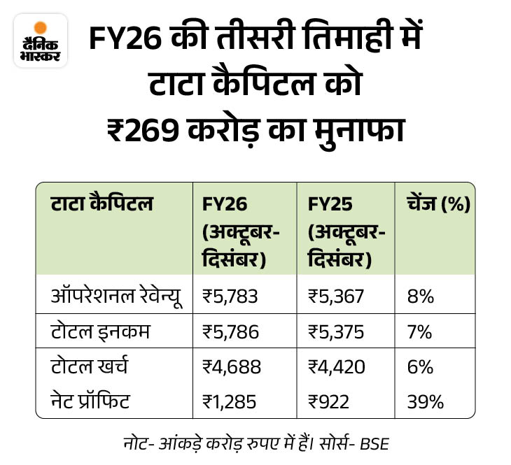 टाटा ग्रुप की नॉन-बैंकिंग फाइनेंशियल कंपनी (NBFC) टाटा कैपिटल को वित्त वर्ष 2025-26 की तीसरी तिमाही में 1,285 करोड़ रुपए का मुनाफा हुआ है। सालाना आधार पर इसमें 39% की बढ़ोतरी हुई है। एक साल पहले की समान तिमाही में कंपनी को 922 करोड़ रुपए का मुनाफा हुआ था।