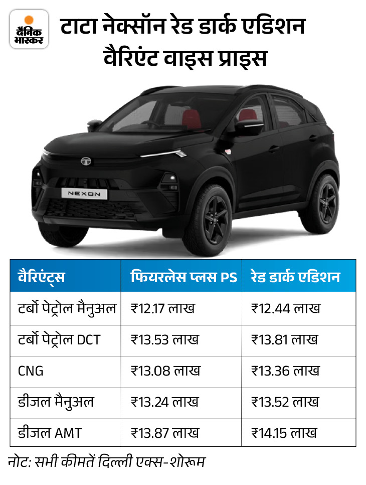 ADAS फीचर्स के साथ नेक्सॉन फियरलेस +PS की कीमत ₹13.53 लाख रुपए रखी गई है, जो मौजूदा कीमत (₹13.26 लाख) से 27,000 रुपए ज्यादा है। इसके अलावा टाटा ने नेक्सॉन रेड डार्क एडिशन को भी ADAS फीचर्स के साथ अपडेट कर पेश किया है, जिसकी एक्स-शोरूम कीमत 13.81 लाख रुपए रखी गई है। ये मौजूदा मॉडल से 28,000 रुपए से ज्यादा है।