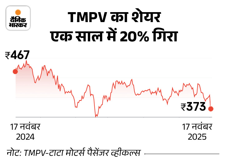 टाटा मोटर्स पैसेंजर व्हीकल्स का शेयर बीते 5 दिन में 8% से ज्यादा गिरा है। वहीं एक महीने में कंपनी का शेयर 6%, छह महीने में 15% और एक साल में 20% गिरा है। कंपनी का मार्केट कैप 1.44 लाख करोड़ रुपए है।