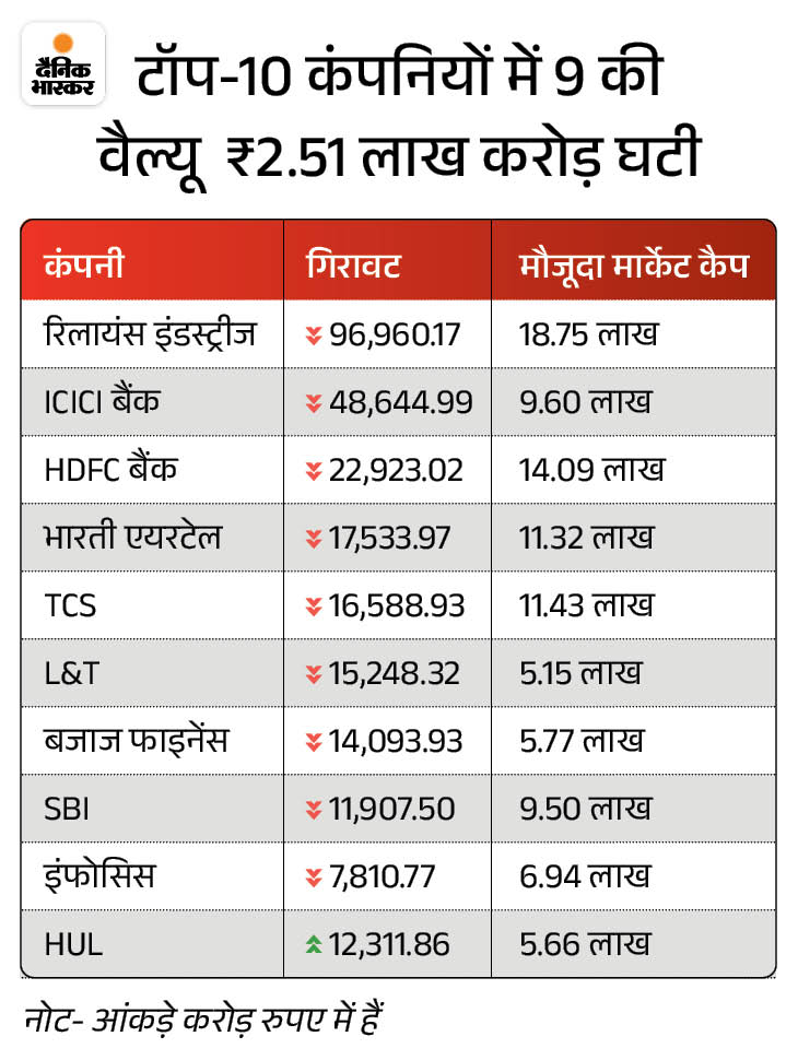 पिछले हफ्ते बाजार में गिरावट से टॉप-10 सबसे वैल्यूएबल कंपनियों में से 9 की मार्केट वैल्यूएशन 2.51 लाख करोड़ रुपए घट गई। इनमें से रिलायंस इंडस्ट्रीज को सबसे ज्यादा नुकसान हुआ। रिलायंस इंडस्ट्रीज की वैल्यूएशन 96,960.17 करोड़ गिरकर 18.75 लाख करोड़ रह गई।