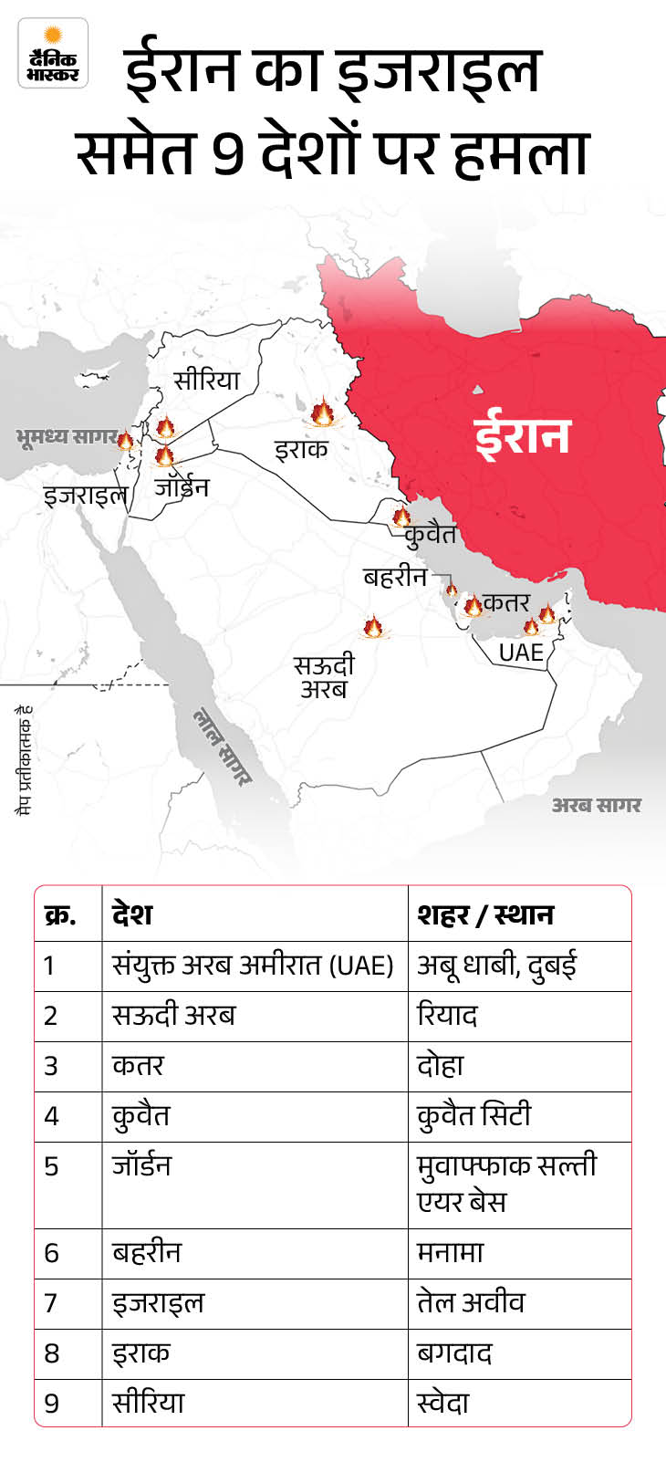 अमेरिका और इजराइल के हमले के जवाब में ईरान ने भी ड्रोन और मिसाइल हमले किए। इन हमलों में इजराइल समेत मिडिल-ईस्ट के 9 देशों को निशाना बनाया गया।