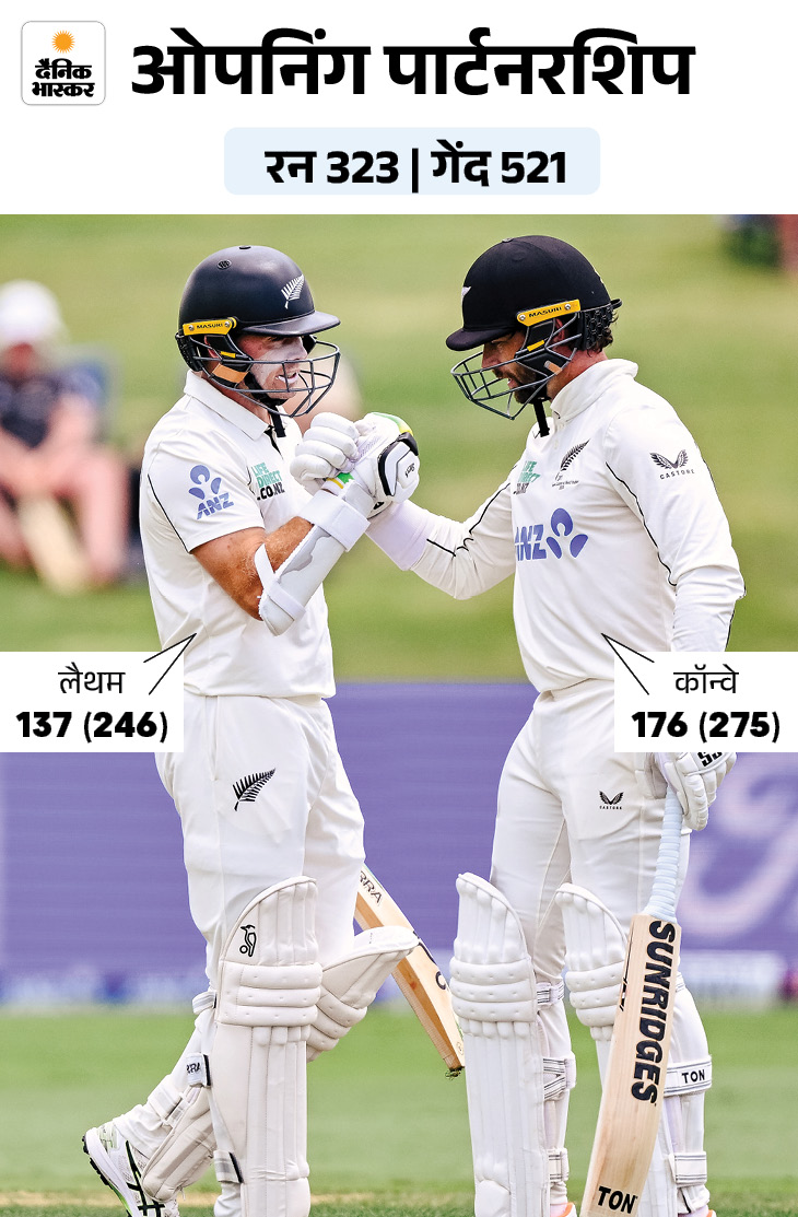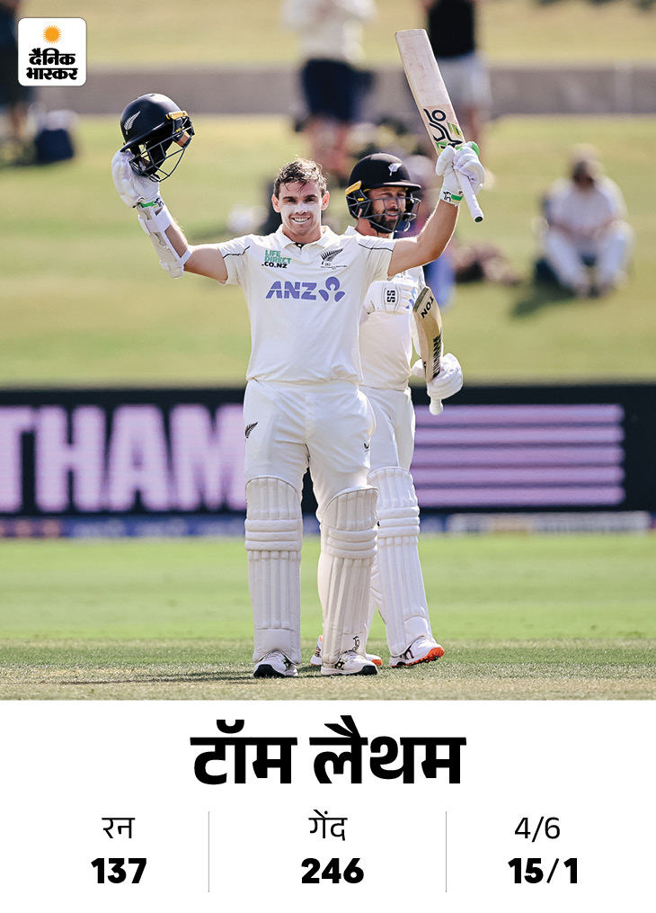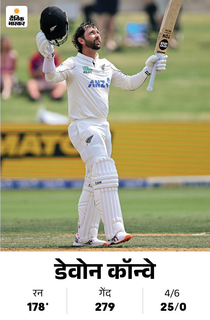 लैथम के आउट होने के बाद डेवोन कॉन्वे मैदान पर डटे रहे। उन्होंने 279 बॉल पर 25 चौकों के सहारे नाबाद 178 रन बनाए। नाइट वॉचमैन जैकब डफी उनका साथ दे रहे हैं।
