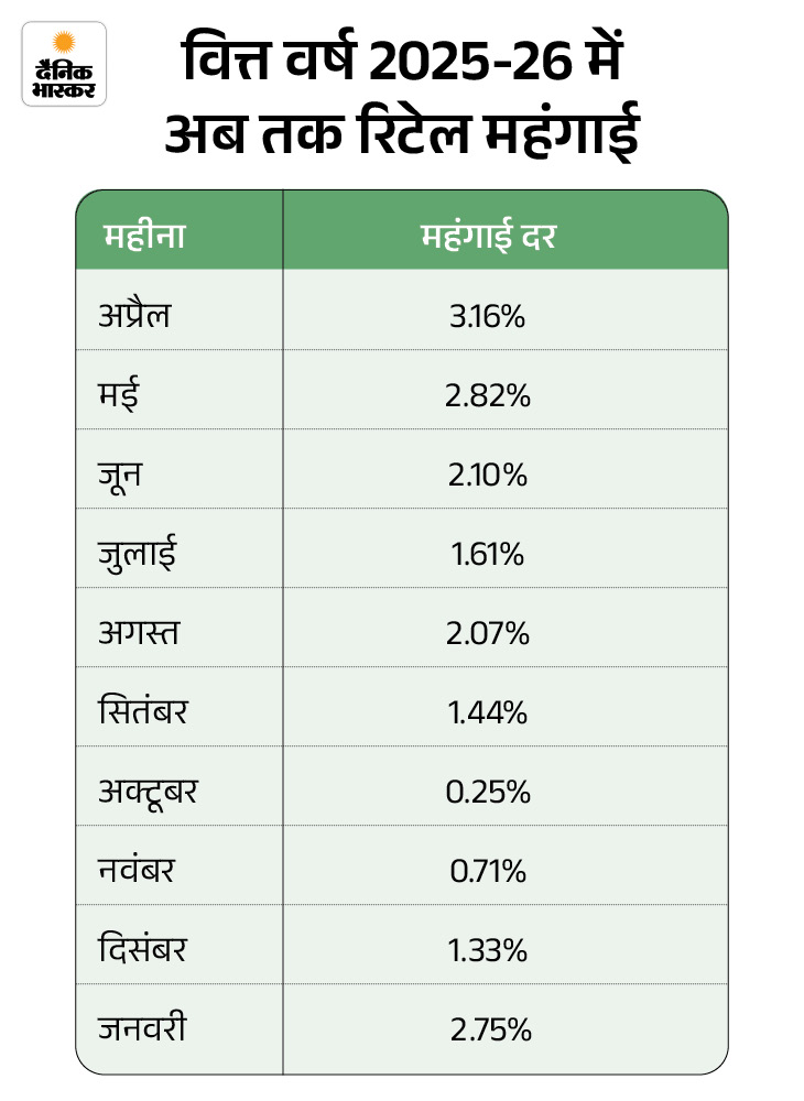 रिटेल महंगाई 8 महीनों के हाई पर जनवरी में रिटेल महंगाई पिछले महीने के मुकाबले बढ़कर 2.75% पर पहुंच गई है। दिसंबर में ये 1.33% पर थी। 8 महीनों में सबसे ज्यादा है। मई 2025 में महंगाई 2.82% पर पहुंच गई थी।