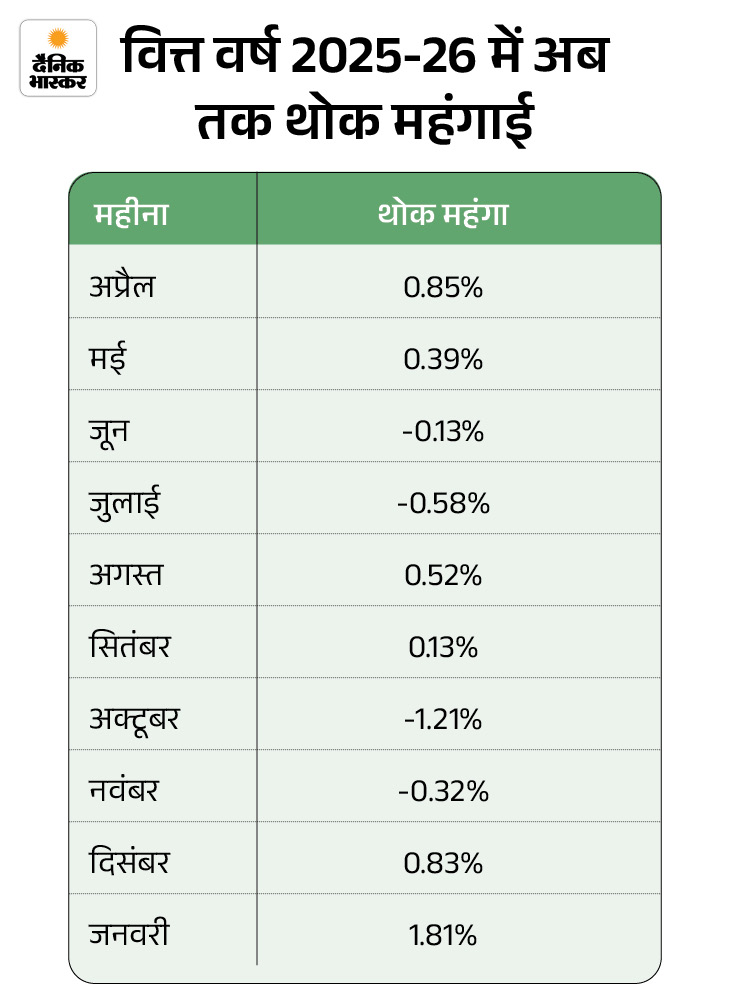 जनवरी में थोक महंगाई (WPI) बढ़कर 1.81% पर पहुंच गई है। इससे पहले दिसंबर में थोक महंगाई 0.83% पर थी। ये 10 महीनों में सबसे ज्यादा है। मार्च 2025 को ये 2.05% पर थी। कॉमर्स मिनिस्ट्री ने आज यानी 16 फरवरी को थोक महंगाई के आंकड़े जारी किए हैं।