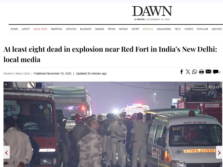 डॉन ने लिखा कि दिल्ली के लाल किले के पास सोमवार शाम एक भीषण धमाका हुआ, जिसमें कम से कम 8 लोगों की मौत और 20 से ज्यादा लोग घायल हो गए। धमाका पुरानी दिल्ली के लाल किला मेट्रो स्टेशन के पास हुआ, जहां सड़क पर कई गाड़ियां खड़ी थीं। धमाके की वजह का अभी पता नहीं चल सका है।