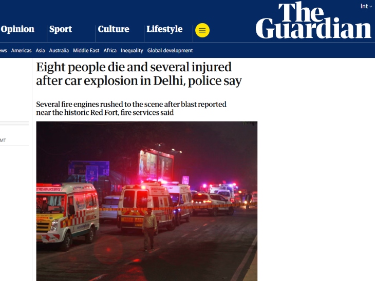 द गार्डियन ने लिखा कि दिल्ली के लाल किले के पास सोमवार को एक कार में हुए जोरदार धमाके में कम से कम 8 लोगों की मौत हो गई और कई लोग घायल हो गए। धमाके से आसपास खड़ी कई गाड़ियां जलकर खाक हो गईं।