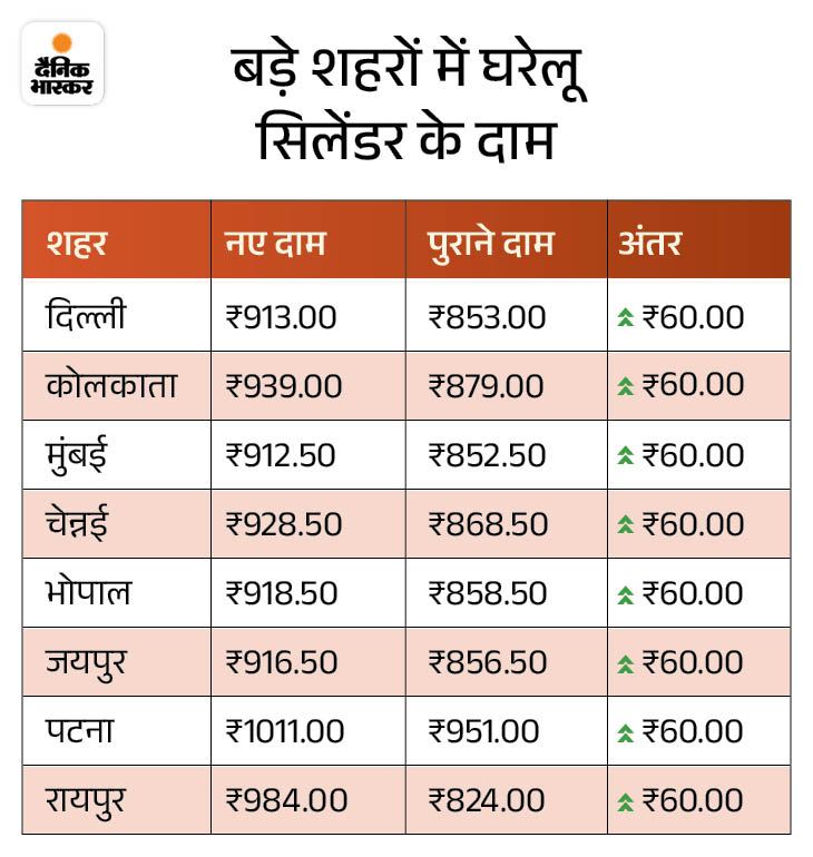 3 दिन पहले सरकार ने घरेलू गैस सिलेंडर के दाम ₹60 बढ़ाए 3 दिन पहले सरकार ने घरेलू गैस सिलेंडर 60 रुपए महंगा कर दिया है। दिल्ली में 14.2 किलोग्राम की LPG गैस अब 913 रुपए की मिल रही है। पहले यह 853 रुपए की थी। वहीं 19 किग्रा वाले कॉमर्शियल सिलेंडर में 115 रुपए का इजाफा किया गया है। यह अब 1883 रुपए का मिल रहा है। बढ़ी हुई कीमतें 7 मार्च से लागू हो गई हैं।