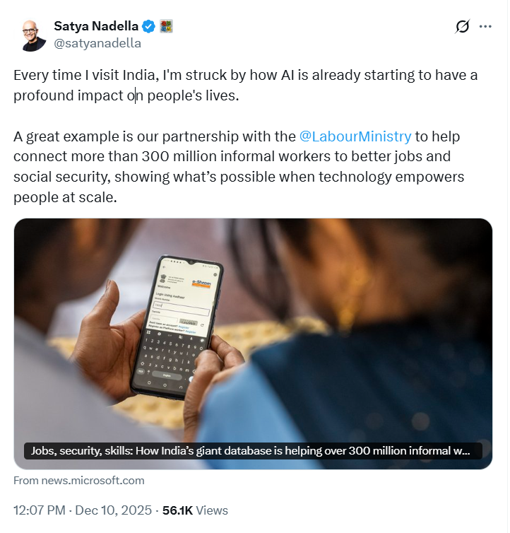 सत्य नडेला ने कहा, ‘हर बार जब मैं भारत आता हूं, मुझे ये देखकर ताज्जुब होता है कि AI यहां लोगों की जिंदगी को कितनी तेजी से बदल रहा है। लेबर मिनिस्ट्री के साथ हमारी पार्टनरशिप इसका एक जबरदस्त उदाहरण है, जिससे असंगठित क्षेत्र के 30 करोड़ से ज्यादा मजदूरों को बेहतर नौकरियों और सोशल सिक्योरिटी से जोड़ा जा रहा है। ये दिखाता है कि जब टेक्नोलॉजी बड़े स्तर पर लोगों को ताकत देती है, तो क्या-क्या हो सकता है।’