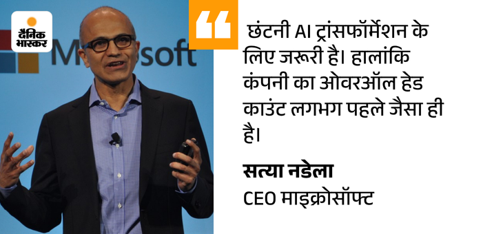 माइक्रोसॉफ्ट के CEO सत्या नडेला ने एक इंटरनल मेमो में कर्मचारियों की छंटनी को AI ट्रांसफॉर्मेशन के लिए जरूरी बताया। इस साल कंपनी करीब 15,000 कर्मचारियों को निकाल चुकी है। इनमें से 9 हजार कर्मचारियों की छंटनी बीते दिनों ही की गई है।