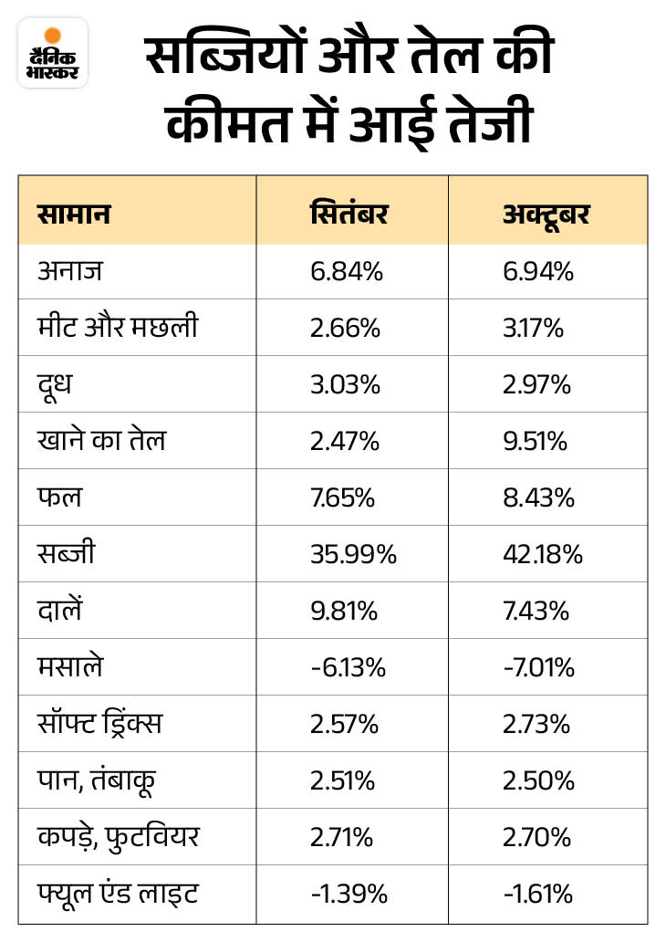 महंगाई के बास्केट में लगभग 50% योगदान खाने-पीने की चीजों का होता है। अक्टूबर में इसकी महंगाई महीने-दर-महीने आधार पर 9.24% से बढ़कर 10.87% हो गई। वहीं ग्रामीण महंगाई 5.87% से बढ़कर 6.68% और शहरी महंगाई 5.05% से बढ़कर 5.62% हो गई।
