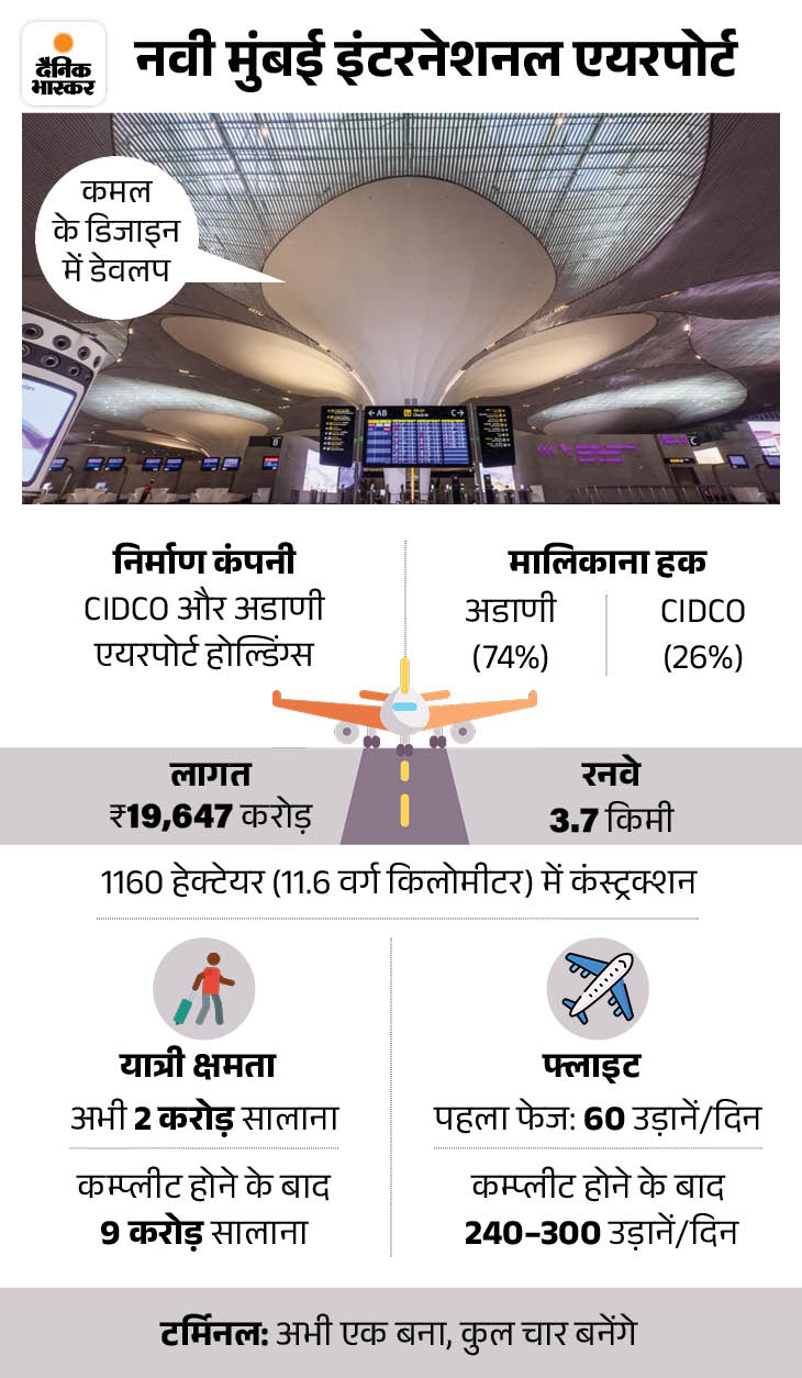 - इस एयरपोर्ट को अडाणी ग्रुप और महाराष्ट्र सरकार का लैंड डेवलपमेंट प्राधिकरण (CIDCO) मिलकर बना रहा है। इसमें अडाणी ग्रुप की 74% हिस्सेदारी है और CIDCO के पास 26% हिस्सेदारी है। ये जवाहरलाल नेहरू पोर्ट और मुंबई ट्रांस-हार्बर लिंक के पास है, जिससे मुंबई में बढ़ती हवाई यात्रा की जरूरत पूरी करने में मदद मिलेगी।