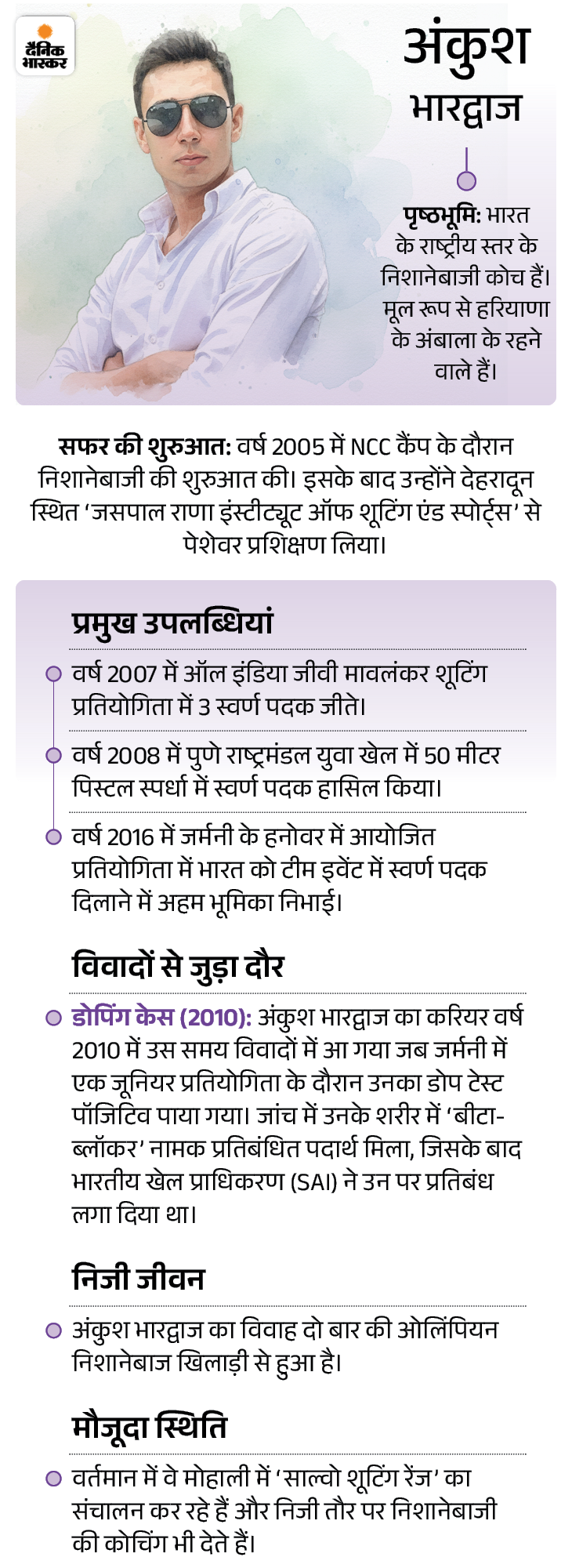 उधर, मामले में संज्ञान लेते हुए नेशनल राइफल एसोसिएशन ऑफ इंडिया ने आरोपी कोच अंकुश भारद्वाज को सस्पेंड कर दिया है। एसोसिएशन का कहना है कि जब तक जांच पूरी नहीं होगी, अंकुश सस्पेंड रहेंगे।