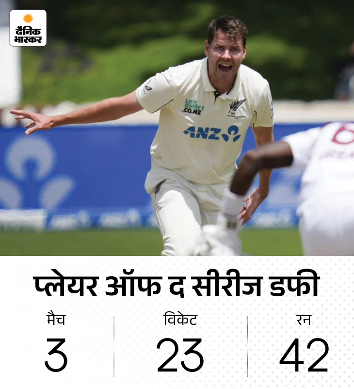 डफी ने 5 और एजाज ने 3 विकेट लिए पांचवें दिन पिच से शानदार बाउंस देखने को मिला और वेस्टइंडीज की बल्लेबाजी पूरी तरह बिखर गई। टीम 80.3 ओवर में सिर्फ 138 रन पर ऑलआउट हो गई। ब्रैंडन किंग ने 67 रन बनाकर थोड़ी पारी को संभालने की कोशिश की लेकिन बाकी बल्लेबाज टिक नहीं सके। डफी ने 5 विकेट लेकर मैच खत्म किया। उनके अलावा एजाज पटेल ने 3 विकेट झटके। ग्लेन फिलिप्स और रचिन रवींद्र को 1-1 विकेट मिला। डफी को प्लेयर ऑफ द सीरीज चुना गया।