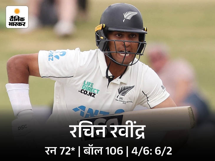 रचिन रवींद्र ने 72 रन की पारी खेली मिडिल ऑर्डर में रचिन रवींद्र ने 72 रन की अहम पारी खेली, जबकि एजाज पटेल 30 रन बनाकर नाबाद रहे। पहले दिन लैथम 137 रन बनाकर आउट हुए थे। उन्होंने 246 गेंदों पर 1 छक्का और 15 चौकों की मदद से 137 रन बनाए, जो उनके टेस्ट करियर का 15वां शतक था।