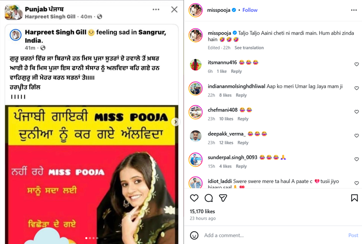 मिस पूजा की मौत की अफवाह की पोस्ट किया मिस पूजा ने फेसबुक ग्रुप में हरप्रीत सिंह गिल नामक यूजर की पोस्ट को इंस्टाग्राम पर डाला है। इसमें हरप्रीत गिल ने लिखा– मिस पूजा गुरू के चरणों में जा विराजे हैं। सूत्रों के हवाले से खबर आई है कि मिस पूजा इस दुनिया को अलविदा कह गए हैं। वाहेगुरू सब पर कृपा करें। हरप्रीत गिल ने मौत पर दुख जताया।