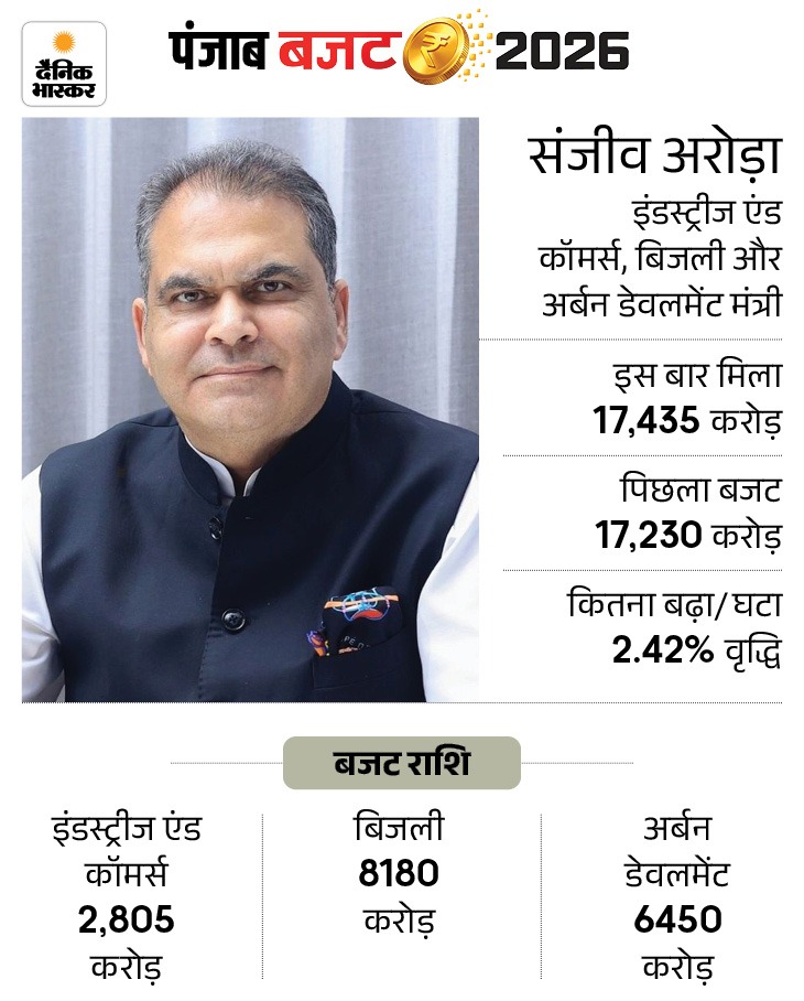 सरकार ने आर्थिक गतिविधियों, ग्रामीण विकास और सामाजिक कल्याण से जुड़े मंत्रालयों को प्राथमिकता दी है। मंत्रियों के विभागों के हिसाब से 8 महीने पहले (3 जुलाई 2025) को मंत्री बने संजीव अरोड़ा के विभागों को सबसे ज्यादा बजट मिला। इनके मंत्रालयों को 17 हजार 435 करोड़ मिले हैं। इसमें बिजली के लिए ही 8 हजार करोड़ रखे गए हैं।