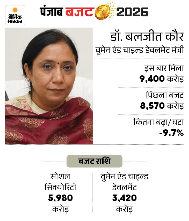 इसी तरह सामाजिक सुरक्षा और महिला-बाल विकास जैसे बड़े कल्याणकारी विभाग, जिन्हें कैबिनेट मंत्री बलजीत कौर संभाल रही हैं, उनके लिए 9 हजार 400 करोड़ का बजट निर्धारित किया गया है।