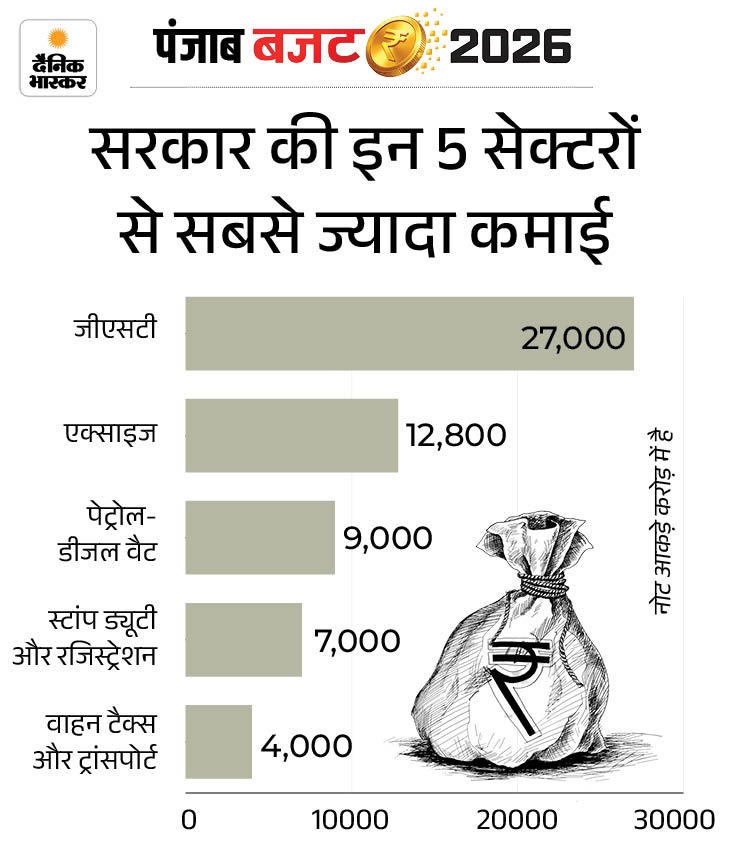 सरकार के खजाने में आने वाले हर एक रुपए का बड़ा हिस्सा कर्ज से आता है, जबकि खर्च का आधे से ज्यादा हिस्सा पुराने कर्ज के ब्याज, वेतन और सब्सिडी में चला जाता है। सरकार की कमाई पर नजर डालें तो हर एक रुपए में लगभग 35 पैसे पंजाब सरकार को कर्ज से आते हैं। करीब 30 पैसे राज्य के अपने टैक्स से मिलते हैं, जिनमें जीएसटी, एक्साइज (शराब पर टैक्स), पेट्रोल-डीजल पर वैट और स्टांप ड्यूटी प्रमुख हैं।