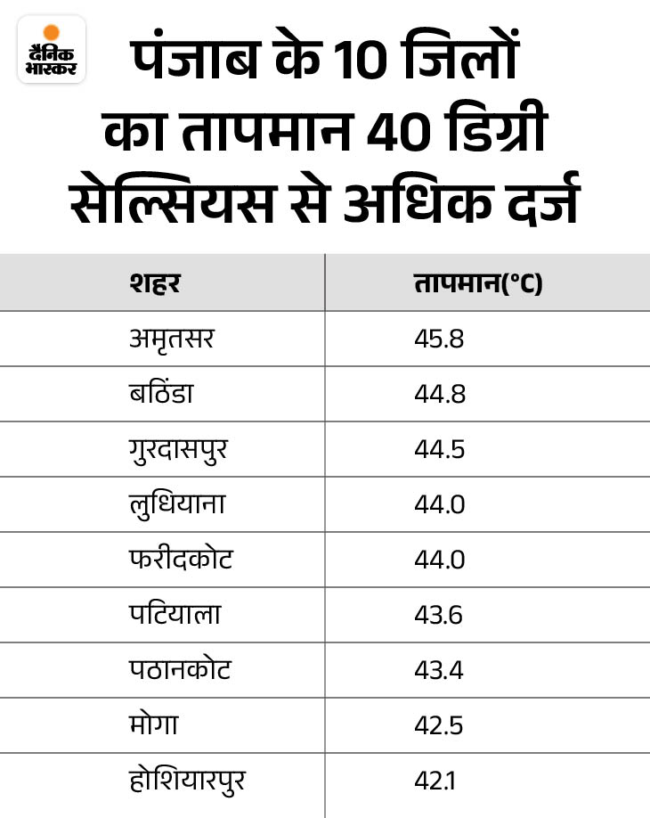 हालांकि, यह तापमान राज्य में सामान्य तापमान से 5.4 डिग्री अधिक है। सबसे अधिक तापमान अमृतसर और बठिंडा में 45.8 डिग्री दर्ज किया गया है। मौसम विभाग के अनुसार, चौदह जून तक लोगों को इस तरह के मौसम का सामना करना पड़ेगा। चंडीगढ़ में 41.9 डिग्री तापमान दर्ज किया गया है।