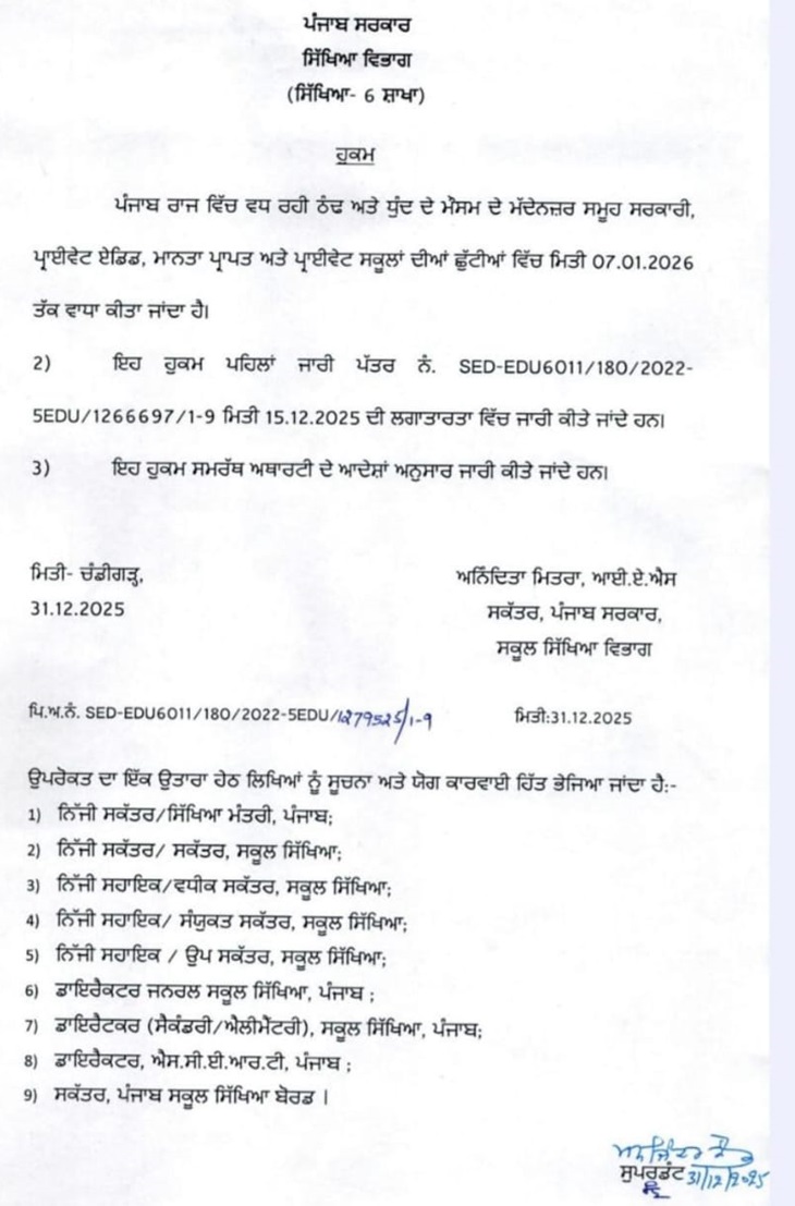 शिक्षा मंत्री हरजोत सिंह बैंस ने सोशल मीडिया (X) पर पोस्ट डालकर लिखा- मुख्यमंत्री भगवंत सिंह मान के दिशा निर्देश पर प्रदेश में लगातार बढ़ रहे कोहरे को देखते हुए बच्चों और स्टाफ की सेहत और सुरक्षा को ध्यान में रखते हुए स्कूलों में 7 जनवरी तक छुट्टियां की जा रही है। 8 जनवरी को पहले की तरह स्कूल खुलेंगे।
