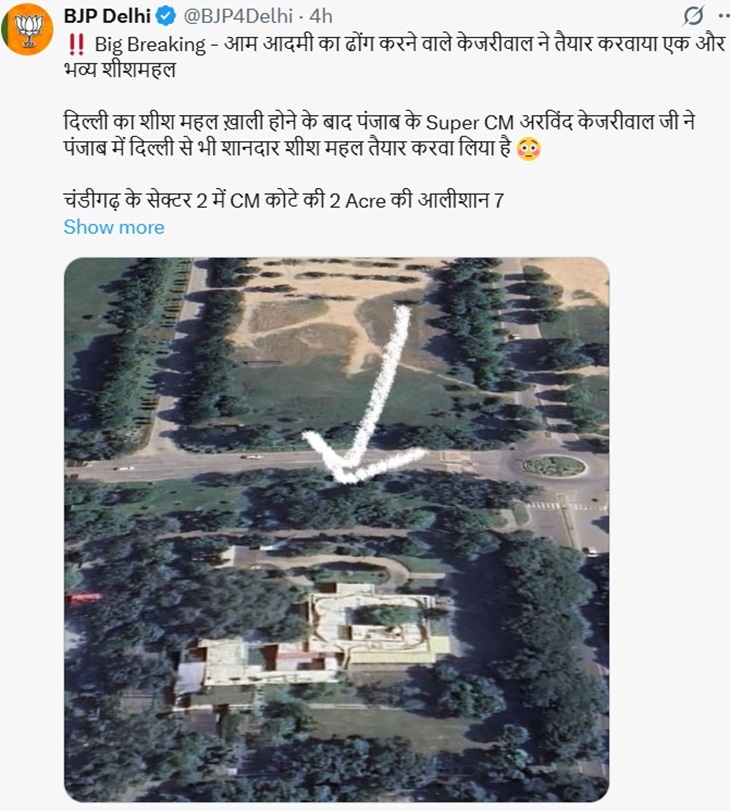 पोस्ट में आगे लिखा दिल्ली का शीशमहल खाली होने के बाद पंजाब के सुपर CM अरविंद केजरीवाल ने पंजाब में दिल्ली से भी शानदार शीशमहल तैयार करवा लिया है। चंडीगढ़ के सेक्टर 2 में CM कोटे की 2 एकड़ की आलीशान 7 स्टार सरकारी कोठी अरविंद केजरीवाल को मिल गई है।