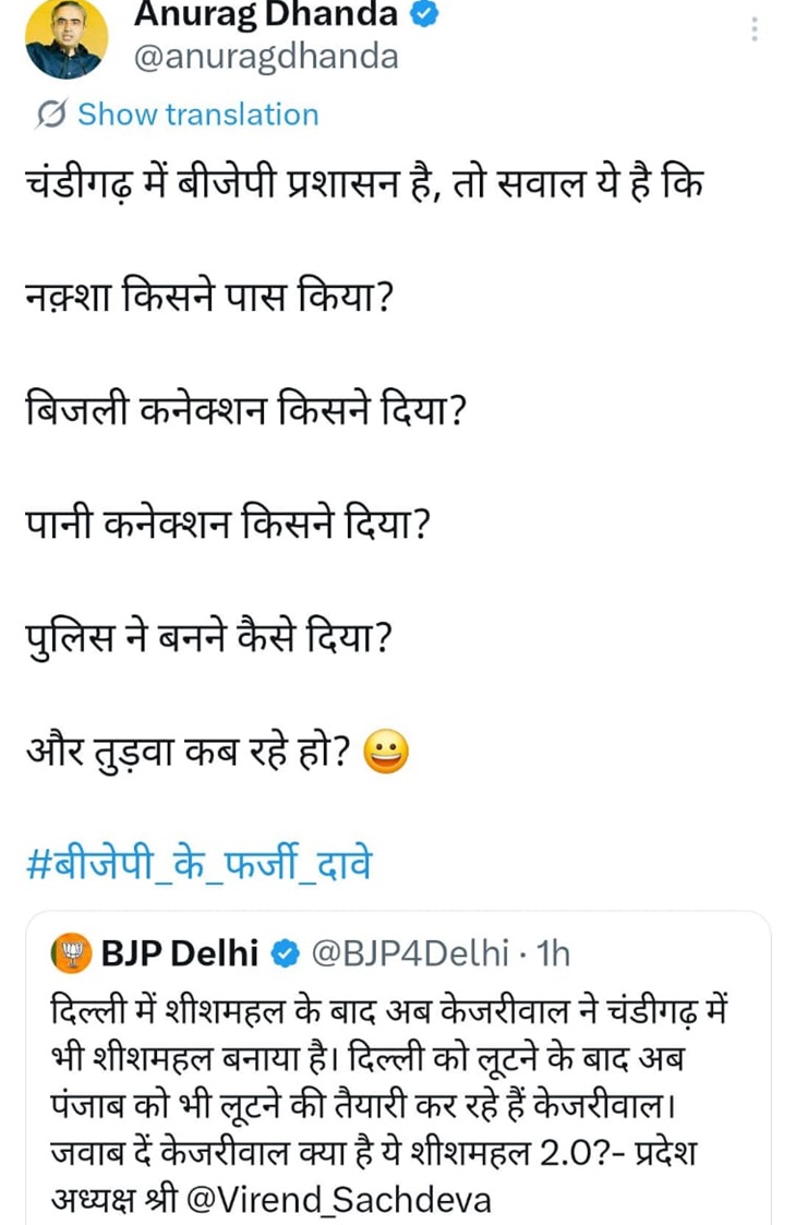 अनुराग ढांडा ने BJP से पूछे सवाल वहीं AAP के राष्ट्रीय प्रवक्ता व मीडिया इंचार्ज अनुराग ढांडा ने कहा कि चंडीगढ़ में बीजेपी प्रशासन है, तो सवाल ये है कि नक्शा किसने पास किया। बिजली कनेक्शन किसने दिया। पानी कनेक्शन किसने दिया। पुलिस ने बनने कैसे दिया और तुड़वा कब रहे हो। बीजेपी के फर्जी दावे।
