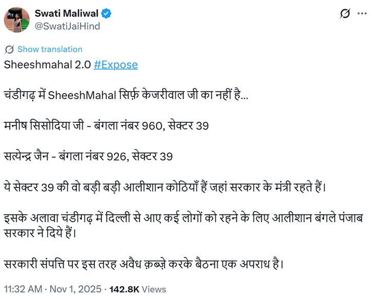 मालीवाल बोलीं– कई मंत्री भी शीशमहल में रहते हैं स्वाती मालीवाल ने शनिवार (1 नवंबर) को सुबह 11:32 बजे एक्स हैंडल पर पोस्ट कर लिखा- चंडीगढ़ में शीशमहल सिर्फ केजरीवाल का नहीं है। मनीष सिसोदिया- बंगला नंबर 960, सत्येन्द्र जैन- बंगला नंबर 926, ये सेक्टर 39 की वो बड़ी-बड़ी आलीशान कोठिया हैं, जहां सरकार के मंत्री रहते हैं। इसके अलावा चंडीगढ़ में दिल्ली से आए कई लोगों को रहने के लिए आलीशान बंगले पंजाब सरकार ने दिए हैं। सरकारी संपत्ति पर इस तरह अवैध कब्जे करके बैठना एक अपराध है।