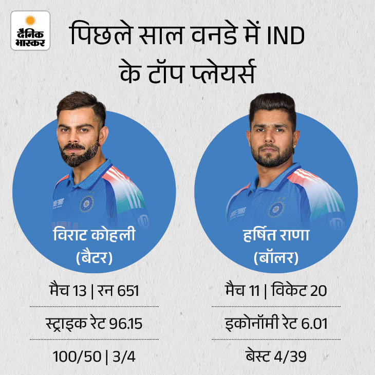 रोहित के साथ विराट कोहली भी सीरीज खेलेंगे। विराट तो साउथ अफ्रीका के खिलाफ पिछली सीरीज में प्लेयर ऑफ द सीरीज बने थे। उन्होंने 2025 में भारत के लिए सबसे ज्यादा रन भी बनाए। कोहली के नाम 13 मुकाबलों में 651 रन रहे, उन्होंने 3 सेंचुरी और 4 फिफ्टी भी लगाईं। गेंदबाजों में हर्षित राणा 20 विकेट लेकर टॉप पर रहे।
