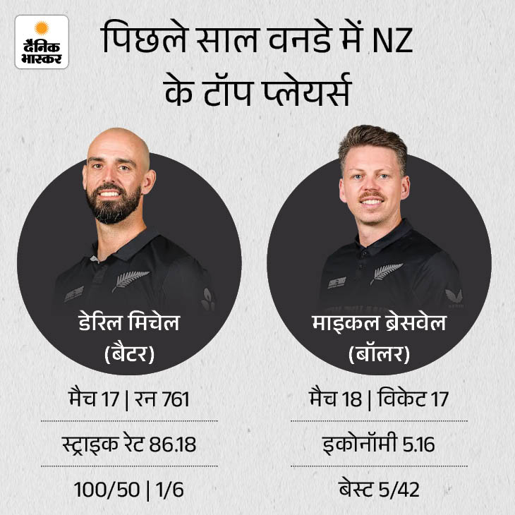 पिछले साल वनडे क्रिकेट में न्यूजीलैंड के लिए डेरिल मिचेल और माइकल ब्रेसवेल सबसे प्रभावशाली खिलाड़ियों में शामिल रहे। डेरिल मिचेल ने 17 मैचों में 761 रन बनाए, जिनमें एक शतक और छह अर्धशतक शामिल रहे। बॉलिंग में माइकल ब्रेसवेल ने 18 मुकाबलों में 17 विकेट झटके।