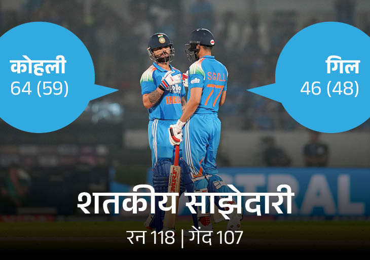 24वें ओवर में कप्तान गिल और विराट कोहली ने दूसरे विकेट के लिए शतकीय साझेदारी पूरी की। गिल ने ग्लेन फिलिप्स के ओवर की 5वीं बॉल पर दौड़कर एक रन लिया और साझेदारी का 100वां रन बनाया। टीम इंडिया ने 39 रन पर रोहित शर्मा का विकेट गंवाया था।