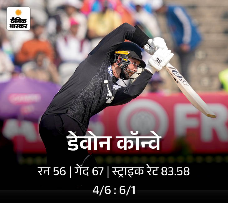 24वें ओवर में न्यूजीलैंड ने दूसरा विकेट गंवाया। यहां पर डेवोन कॉन्वे 56 रन बनाकर आउट हुए। उन्हें हर्षित राणा ने बोल्ड किया।
