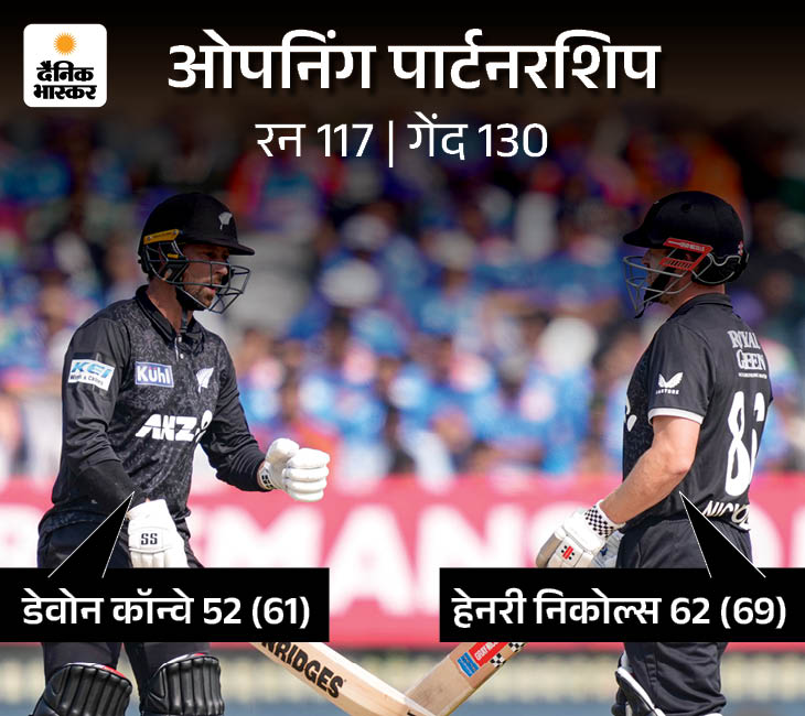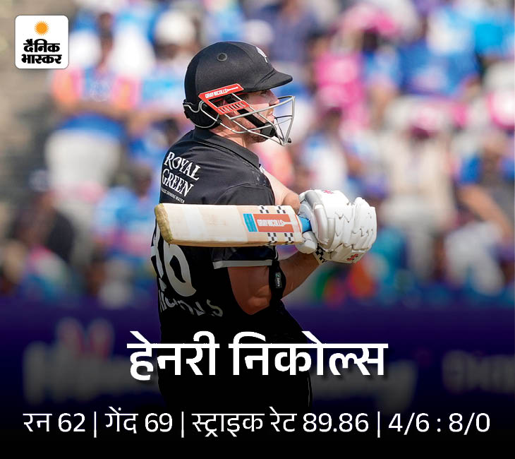 22वें ओवर में न्यूजीलैंड ने पहला विकेट गंवाया। यहां पर हेनरी निकोल्स 62 रन बनाकर आउट हुए। उन्हें हर्षित राणा ने विकेटकीपर केएल राहुल के हाथों कैच कराया। इसी के साथ 117 रन की शतकीय साझेदारी ब्रेक हुई।