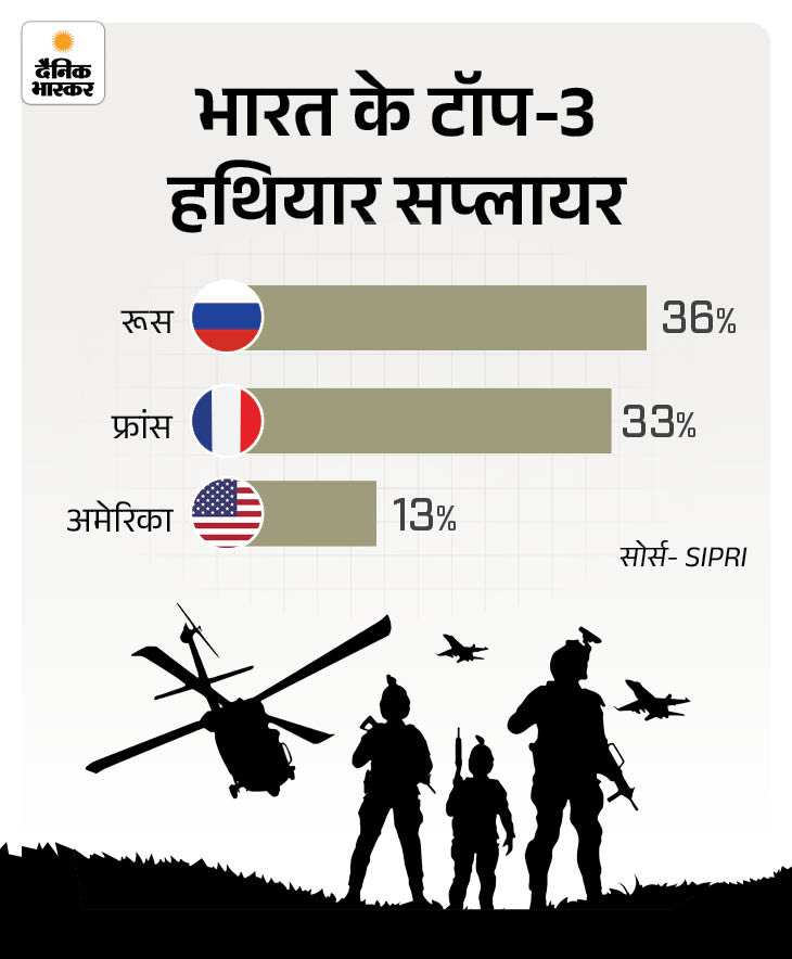 SIPRI की रिपोर्ट के मुताबिक जहां 2000 के दशक में रूस, भारत को 70% से 90% तक हथियार सप्लाई करता था, वहीं अब यह घटकर लगभग 36% रह गया है।