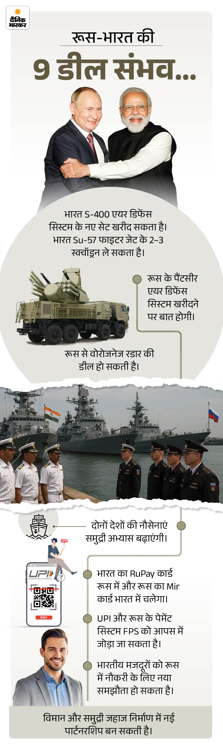 पुतिन की इस यात्रा में दोनों देश एक नया पेमेंट सिस्टम बनाने पर सहमत हो सकते हैं, जिससे व्यापार बिना रुकावट चलता रहे। इसमें रुपया-रूबल ट्रेड, डिजिटल भुगतान या किसी तीसरे देश के बैंक का इस्तेमाल जैसे सिस्टम शामिल हो सकते हैं।