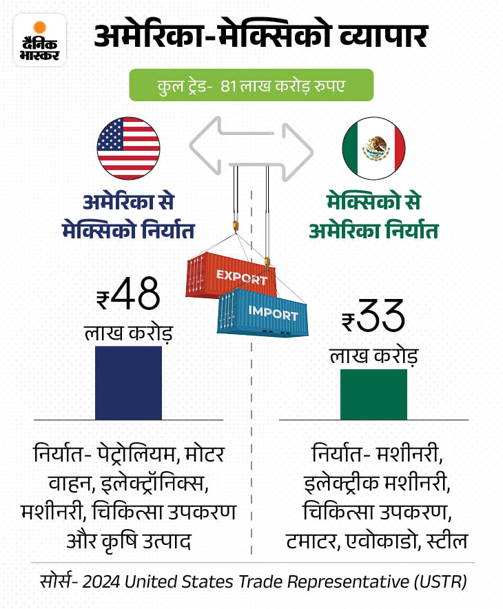 मेक्सिको अमेरिका के साथ ट्रेड करने में पहले स्थान पर है। 2024 में अमेरिका के साथ व्यापार में मेक्सिको की भागीदारी 16% थी। ये अब और बढ़ सकती है।