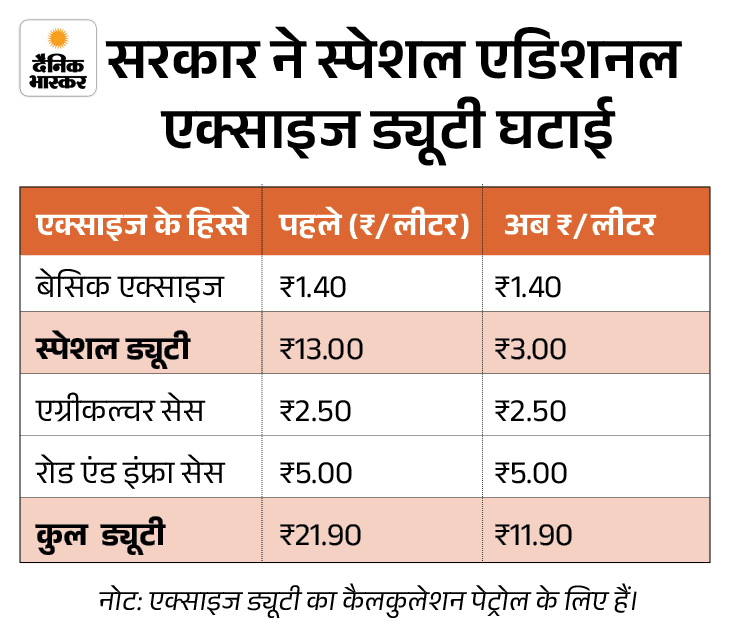 जवाब: न्यूज एजेंसी के मुताबिक, सरकार ने पेट्रोल पर एक्साइज ड्यूटी में ₹10 की कमी की है, जिससे अब यह घटकर ₹3 प्रति लीटर रह गई है। वहीं, डीजल पर भी ₹10 की कटौती की गई है, जिससे अब डीजल पर लगने वाली एक्साइज ड्यूटी जीरो हो गई है।