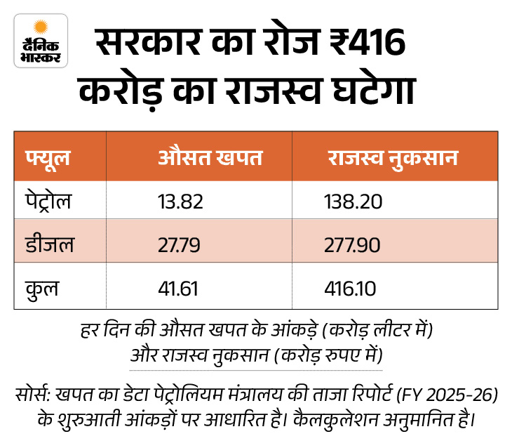 जवाब: पेट्रोलिमय मंत्री हरदीप सिंह पुरी के मुताबिक तेल कंपनियां फिलहाल पेट्रोल पर 24 रुपए प्रति लीटर और डीजल पर 30 रुपए का घाटा सह रही हैं। वेस्ट एशिया में चल रहे तनाव के कारण ये कंपनियां महंगा क्रूड खरीद रही हैं, लेकिन उन्होंने दाम नहीं बढ़ाए है। कंपनियां अब इस टैक्स कटौती का इस्तेमाल मार्जिन को स्थिर रखने में करेंगी।